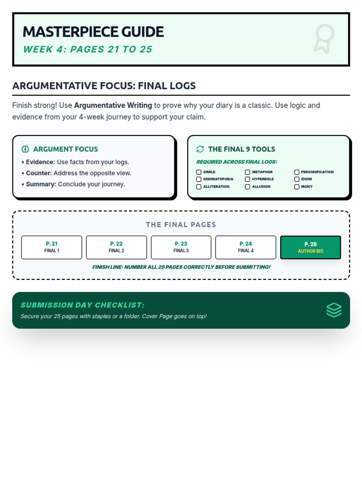 A single-page instruction sheet for Week 4 of the diary unit, detailing the Argumentative writing requirements and the comprehensive mix of all 9 figurative language devices for pages 21-25. Updated with clarity and fixed abbreviations.