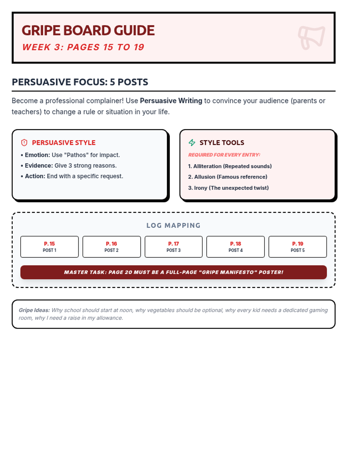 A single-page instruction sheet for Week 3 of the diary unit, detailing the Persuasive writing requirements and the mandatory use of alliteration, allusion, and irony for pages 15-19. Updated with fixed typo and clarity.