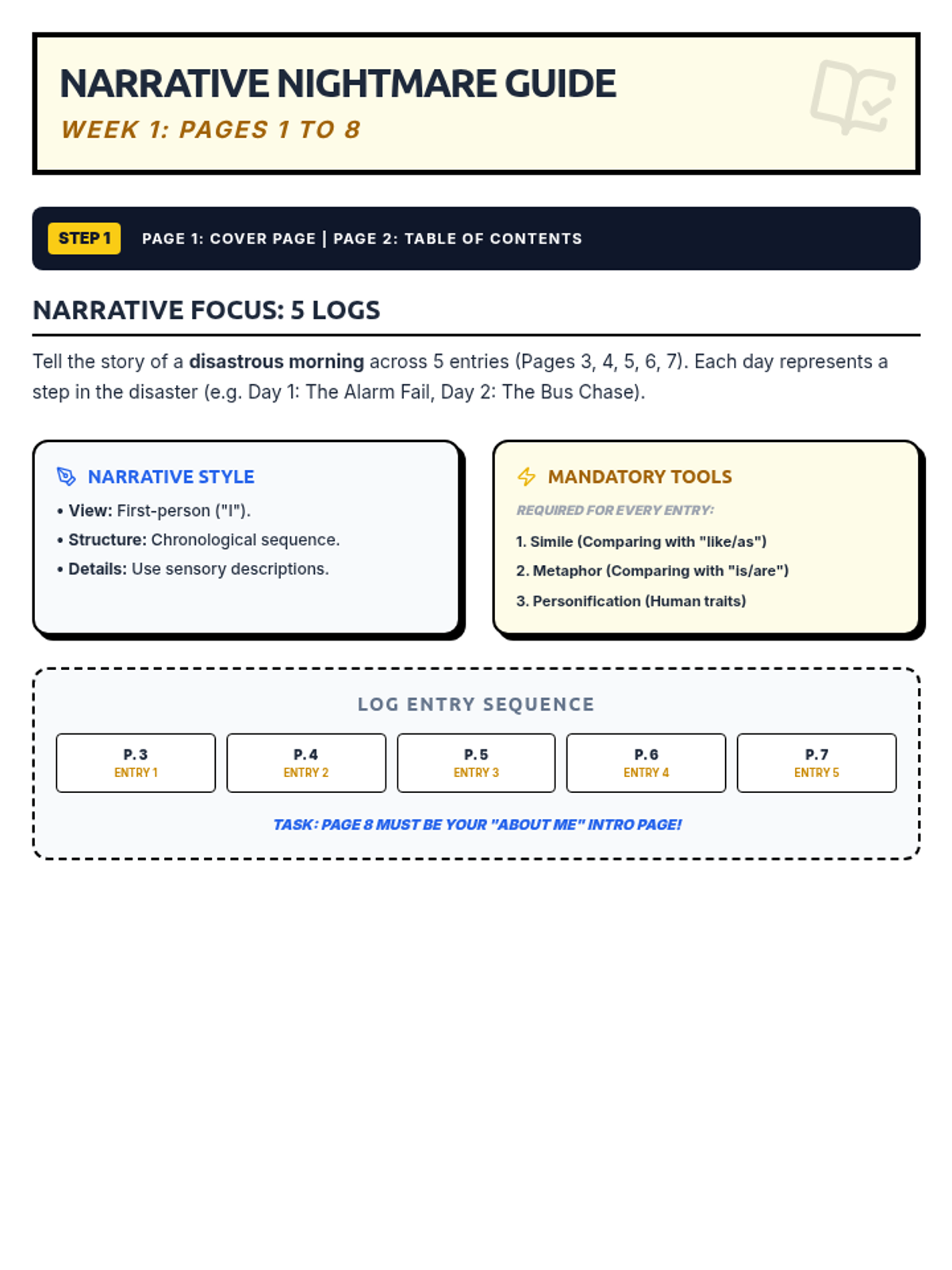A single-page instruction sheet for Week 1 of the diary unit, explicitly detailing the Narrative writing requirements and the mandatory use of similes, metaphors, and personification for pages 3-7. Doodle mandate removed.