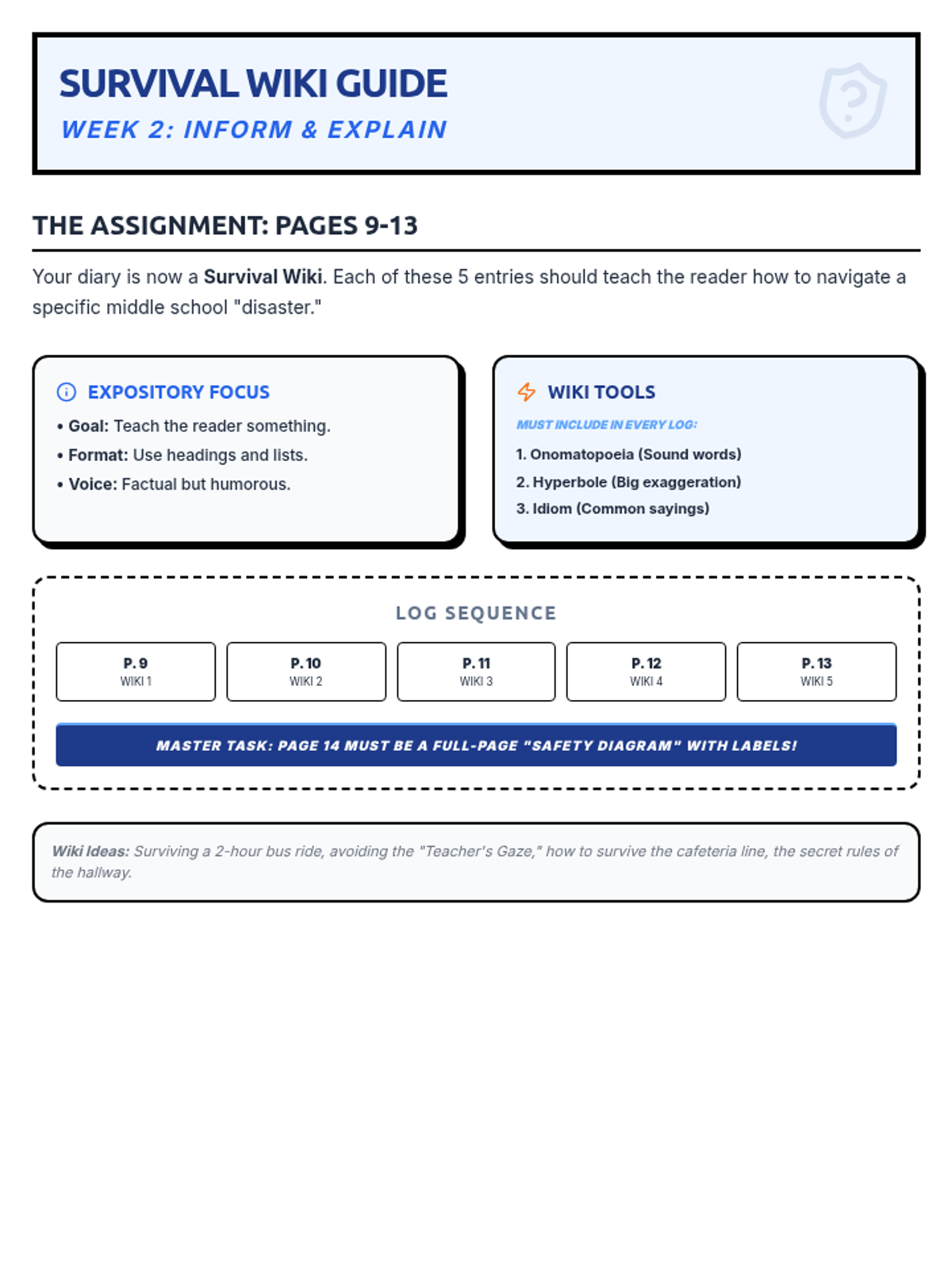 A single-page instruction sheet for Week 2 of the diary unit, explicitly detailing the Expository writing requirements and the mandatory use of onomatopoeia, hyperbole, and idioms for pages 9-13.