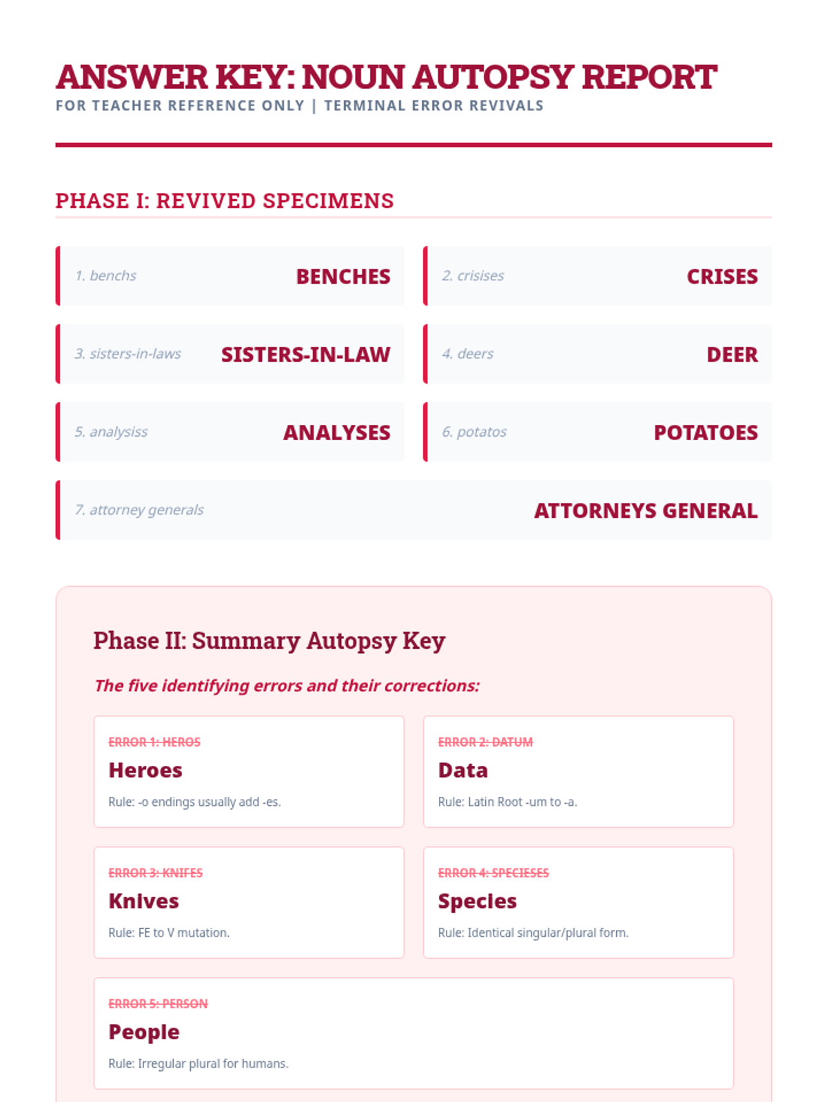 An answer key for the Noun Autopsy Worksheet, identifying the 7 sentence errors and 5 paragraph errors with corresponding rules. Fixed page breaks and compound noun typo.