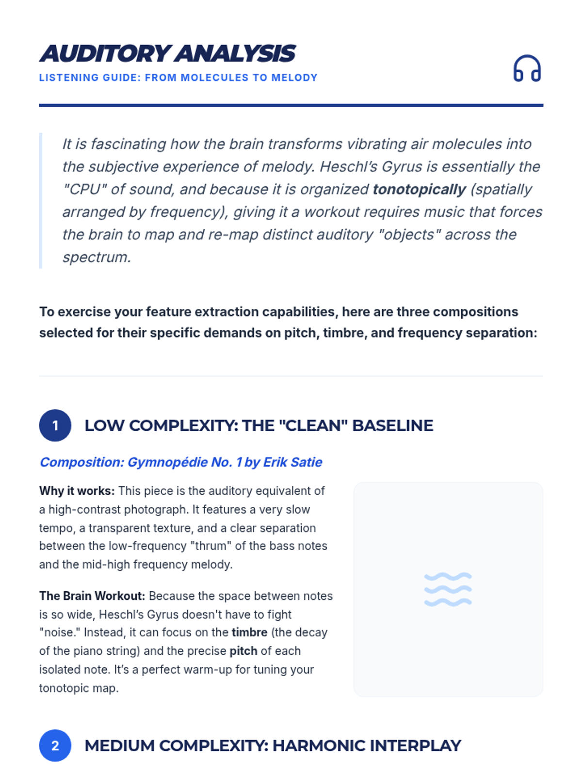 A detailed listening guide for students that analyzes three specific musical compositions (Satie, Bach, and Stravinsky) through the lens of auditory neuroscience and feature extraction.