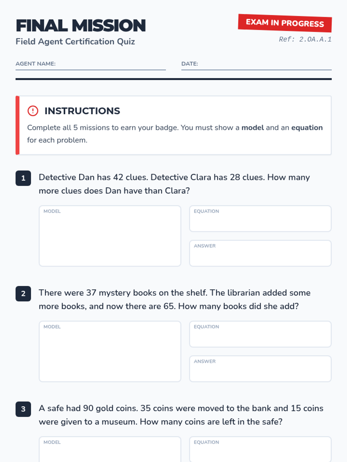 A 5-question summative quiz for 2nd grade word problems within 100, featuring a certification theme and a mix of one- and two-step problems.