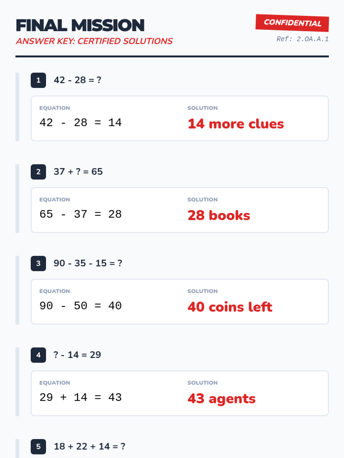 Teacher-facing answer key for the Mountain Math practice worksheet. Includes full solutions for all levels and word problem explanations.