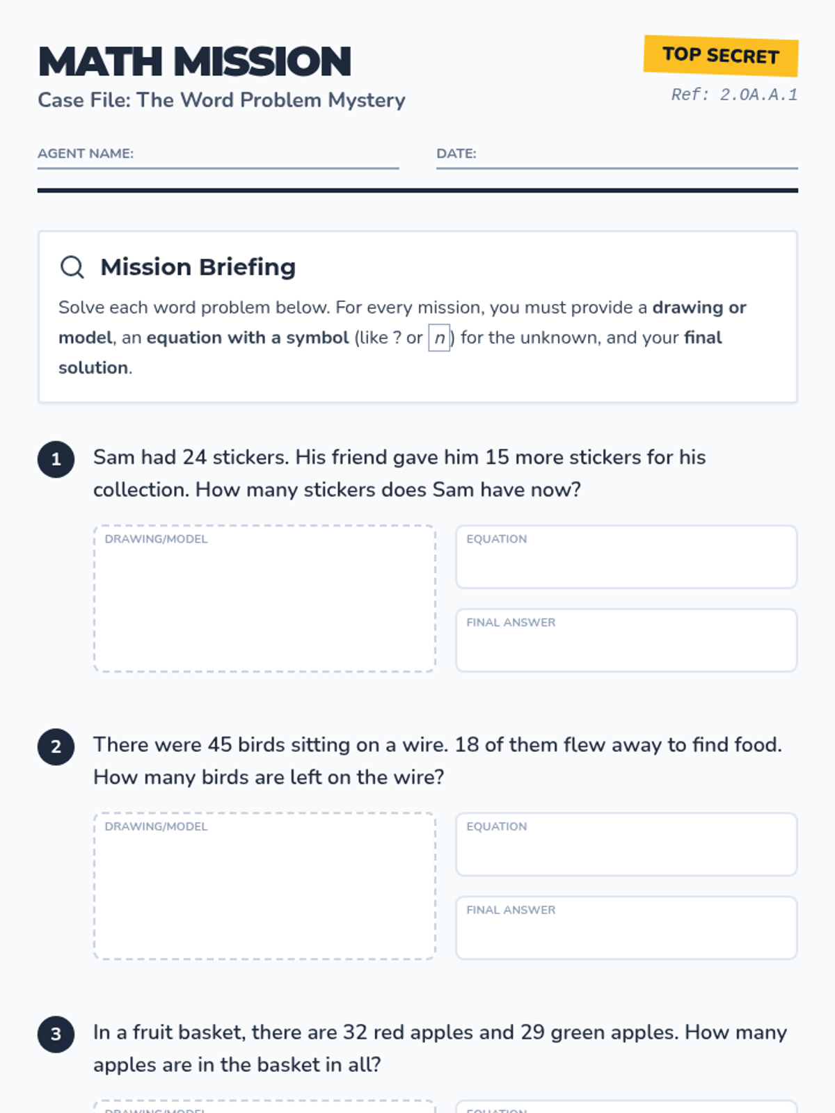 A detective-themed presentation for introducing word problem solving strategies. Includes step-by-step guidance for one- and two-step problems using tape diagrams as a visual model.