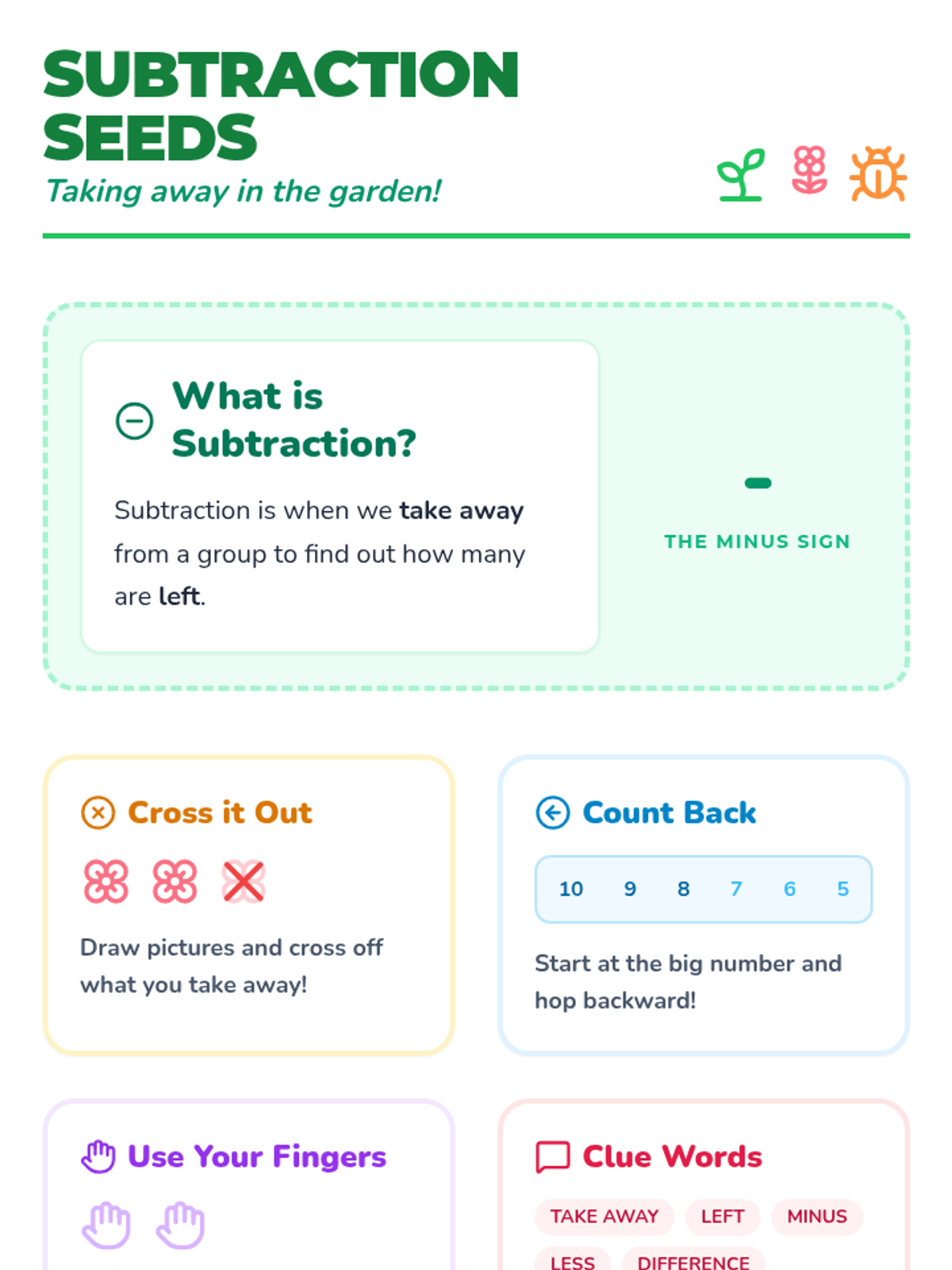 A garden-themed anchor chart for kindergarteners covering subtraction concepts within 10, featuring visual strategies and a large example equation.