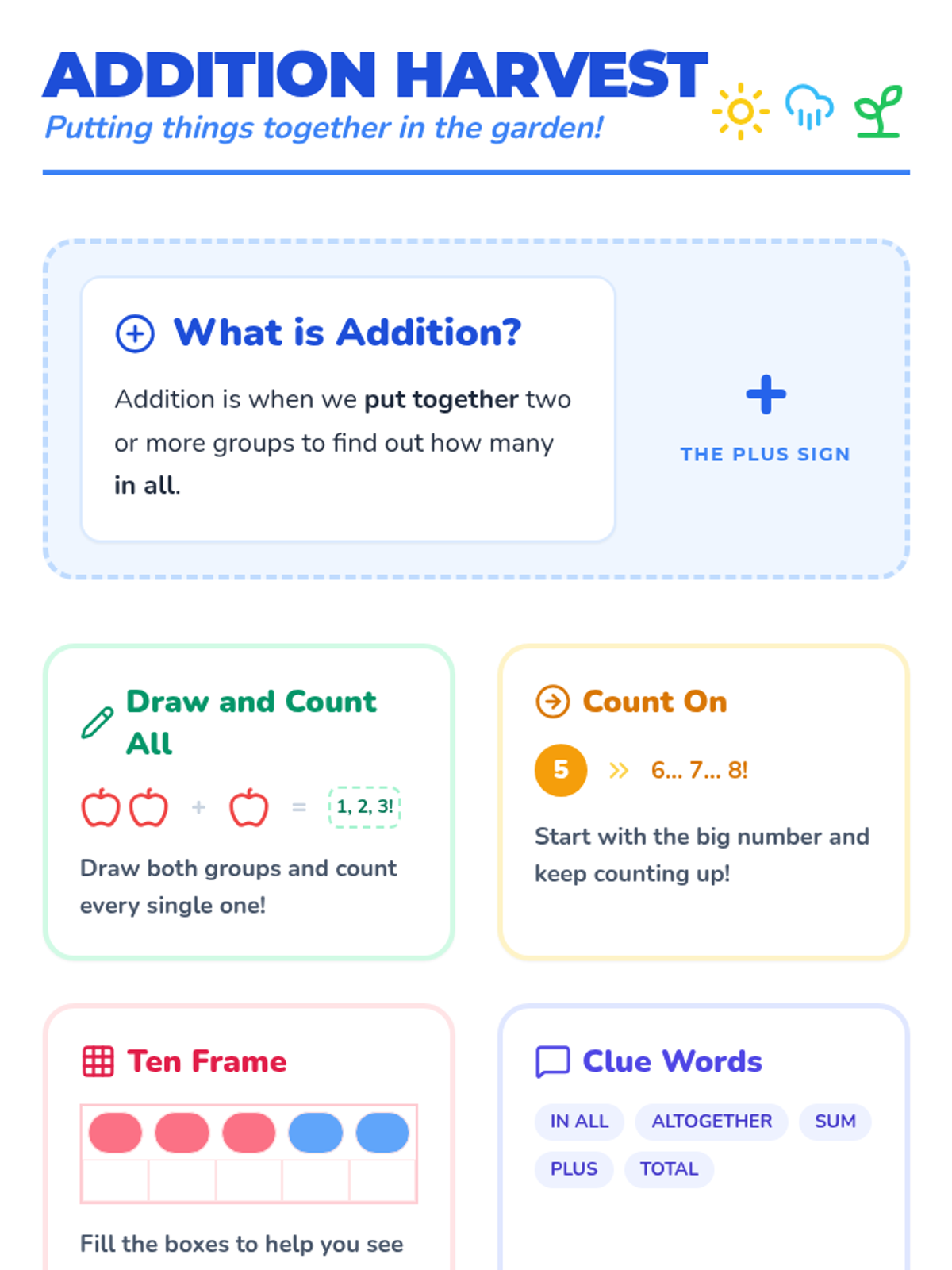 A garden-themed anchor chart for kindergarteners covering addition concepts within 10, including visual strategies like counting all, counting on, and key vocabulary.