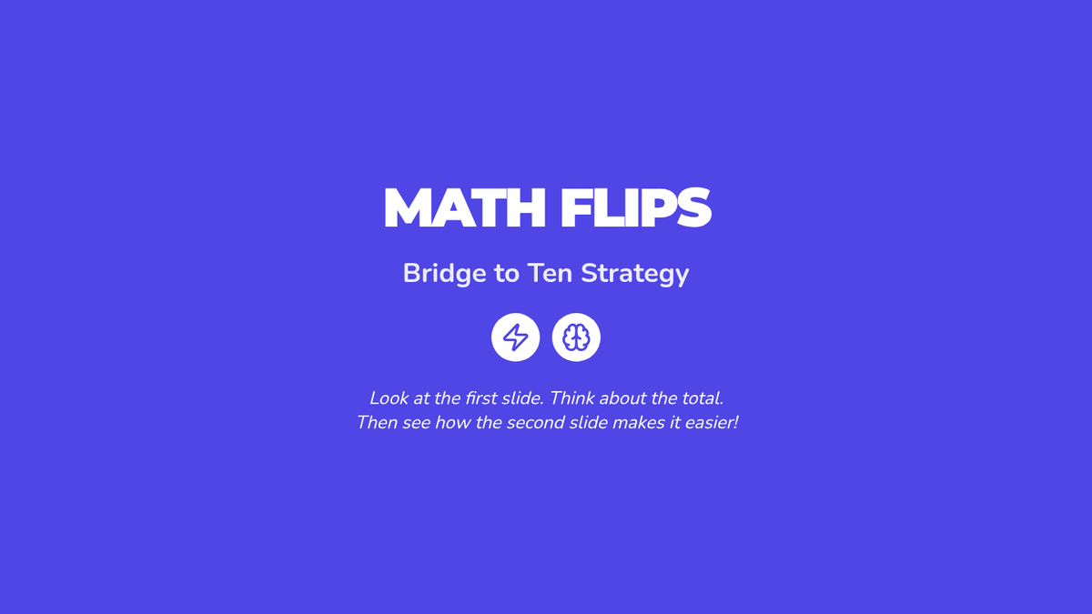 A 22-slide presentation featuring 10 'Math Flip' pairs focused on the bridge-to-ten strategy. Each pair uses visual ten-frame prompts to help students transition from basic counting to strategic mental decomposition for addition and subtraction within 20.