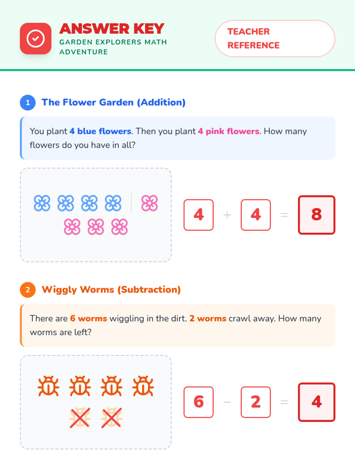 Teacher answer key for the Garden Explorers math worksheet, showing completed equations, drawings, and pattern sequences.