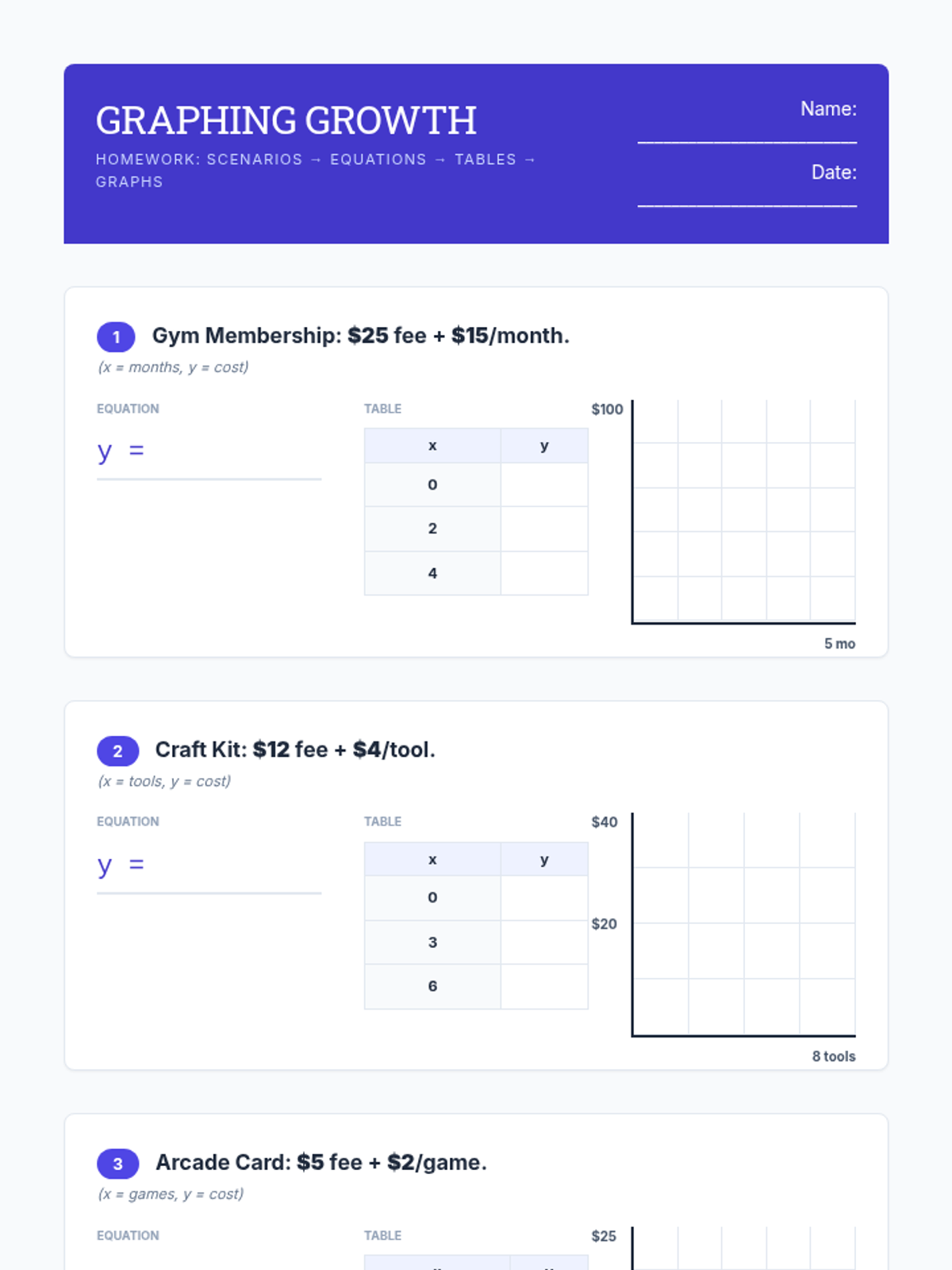 A comprehensive homework assignment containing 6 real-world scenarios. Students must create a linear equation, complete a table of values, and sketch a graph for each problem. Multi-page layout with clear workspace for student work.