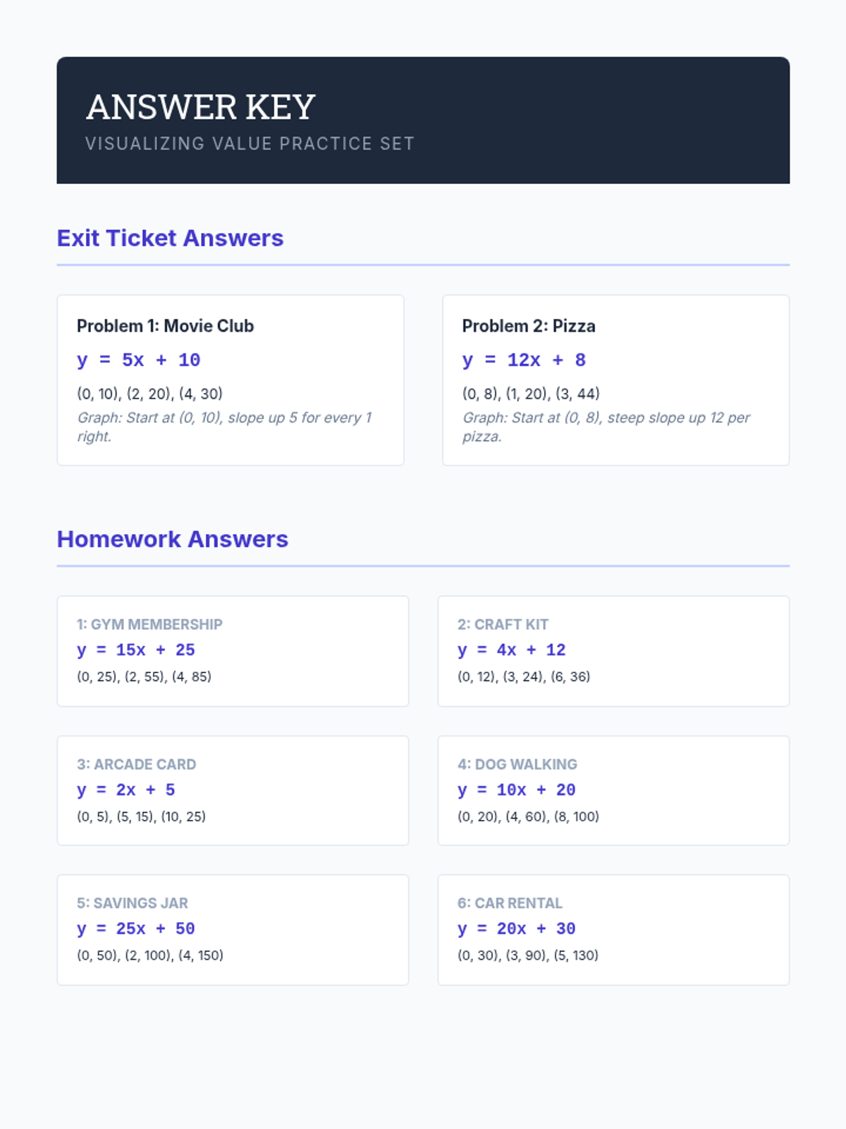 Teacher's answer key for the Value Check Exit Ticket and Graphing Growth Homework. Includes equations, selected table values, and graphing descriptions.