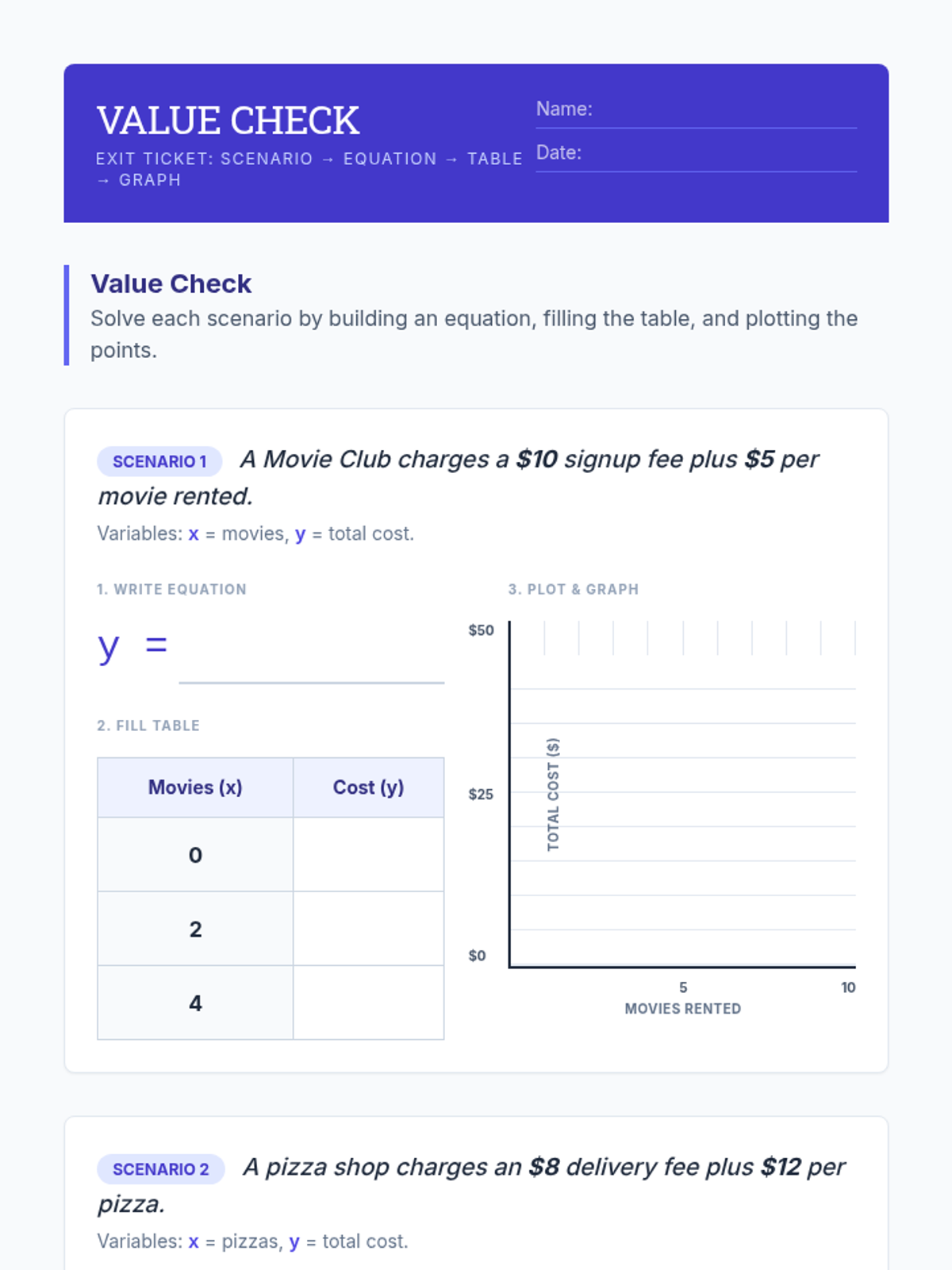 A 2-problem exit ticket requiring students to translate real-world cost scenarios into linear equations, tables of values, and coordinate graphs. Includes Movie Club and Pizza Delivery scenarios.