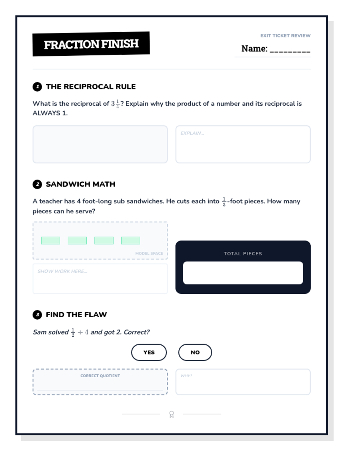 A set of exit tickets for fraction division. Revised to fit one page, added calculation work space, and removed interior placeholder text. fixed icons.