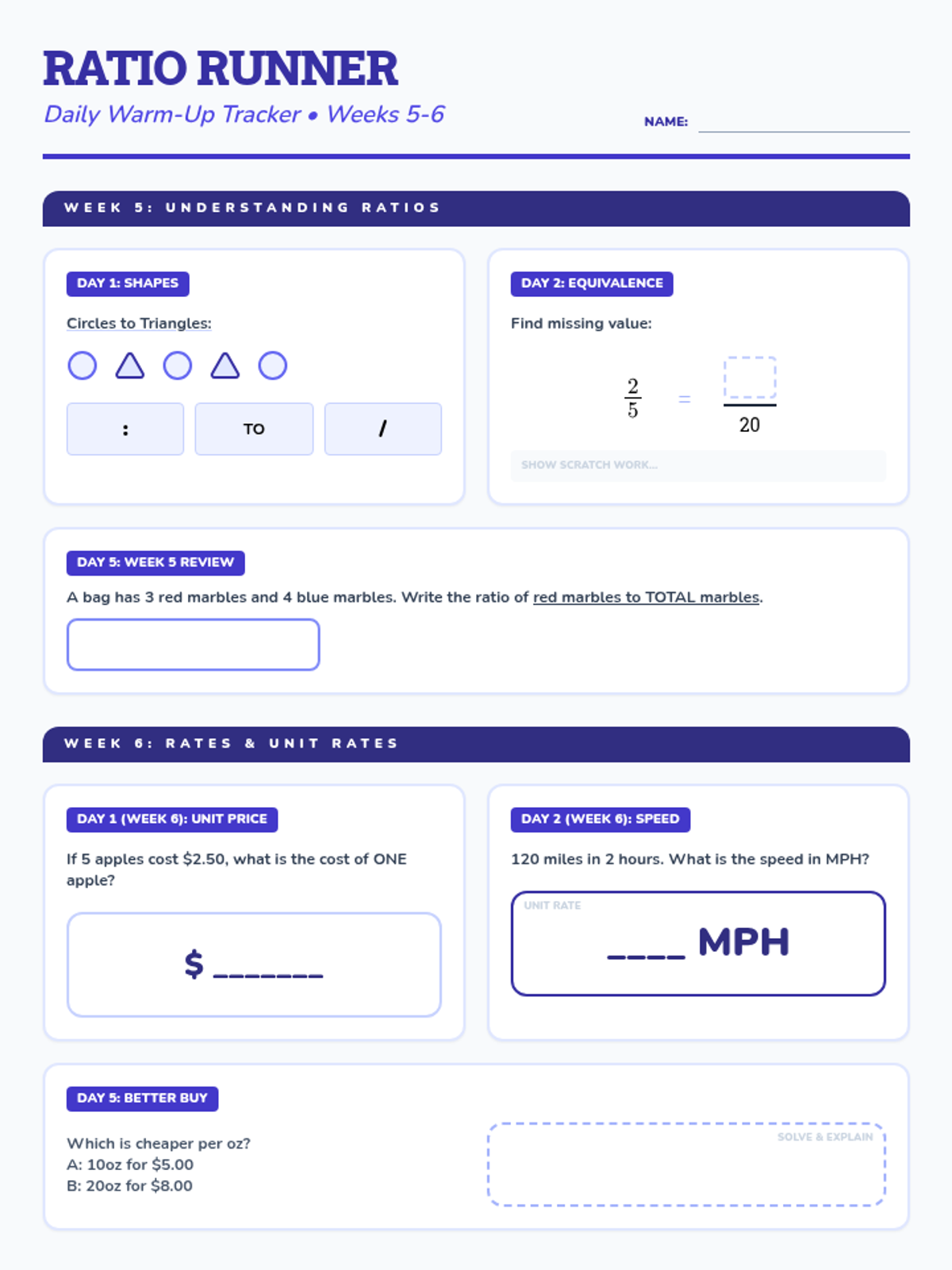 Daily warm-ups for Weeks 5 and 6. Revised to include Day 5 for both weeks, lightened answer area backgrounds for legibility, and added scratch work space.