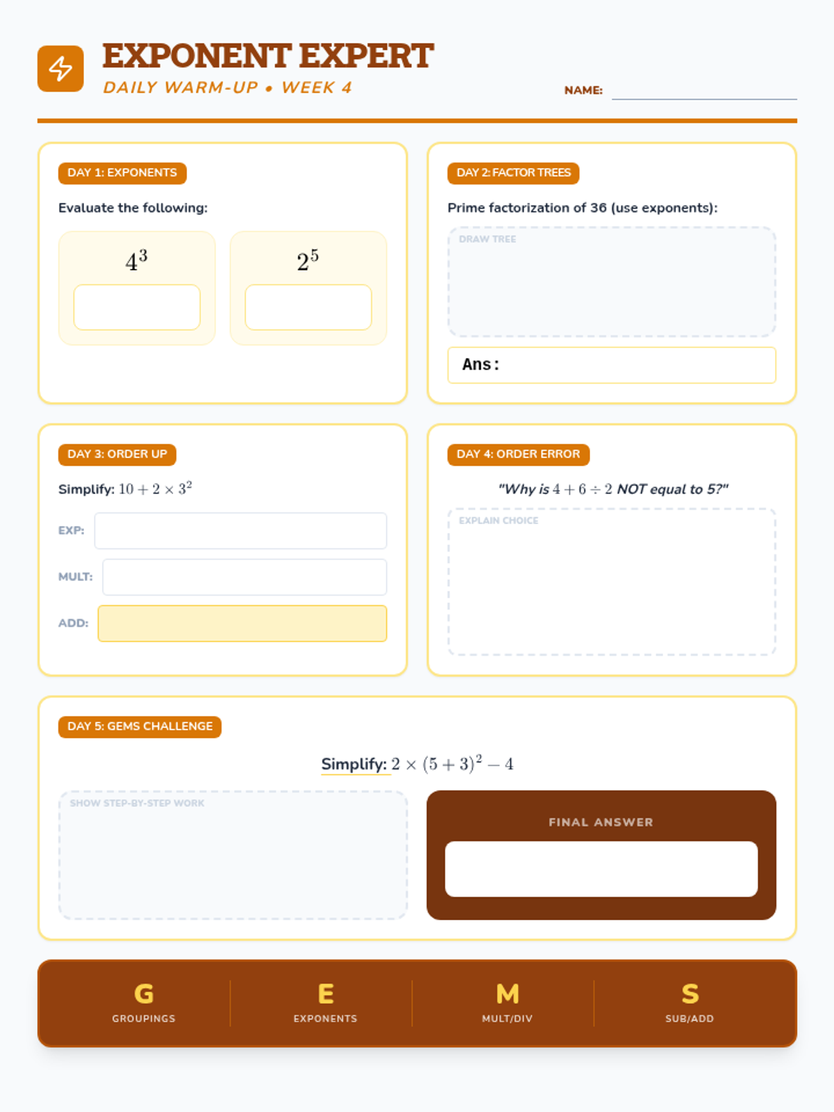 Daily warm-ups for Week 4. Revised to fit one page, added Day 5, increased height of answer boxes, and improved GEMS reference visual.