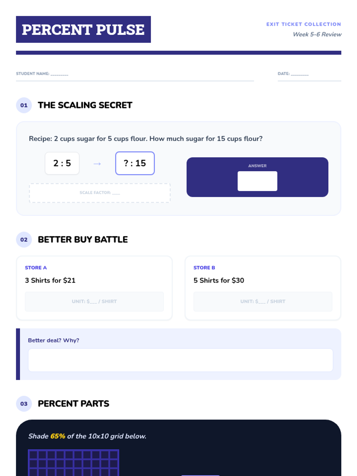 Exit ticket collection for Ratios and Percents. Revised with a complete 10x10 grid, improved page breaks, calculation work areas, and high-contrast student input fields.