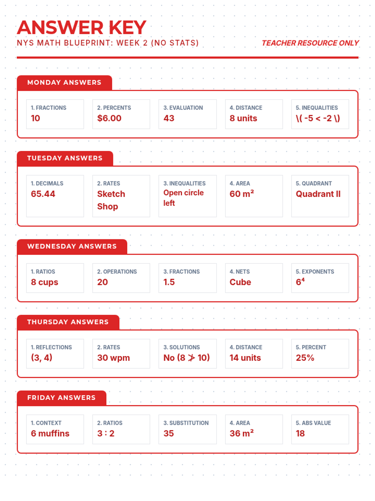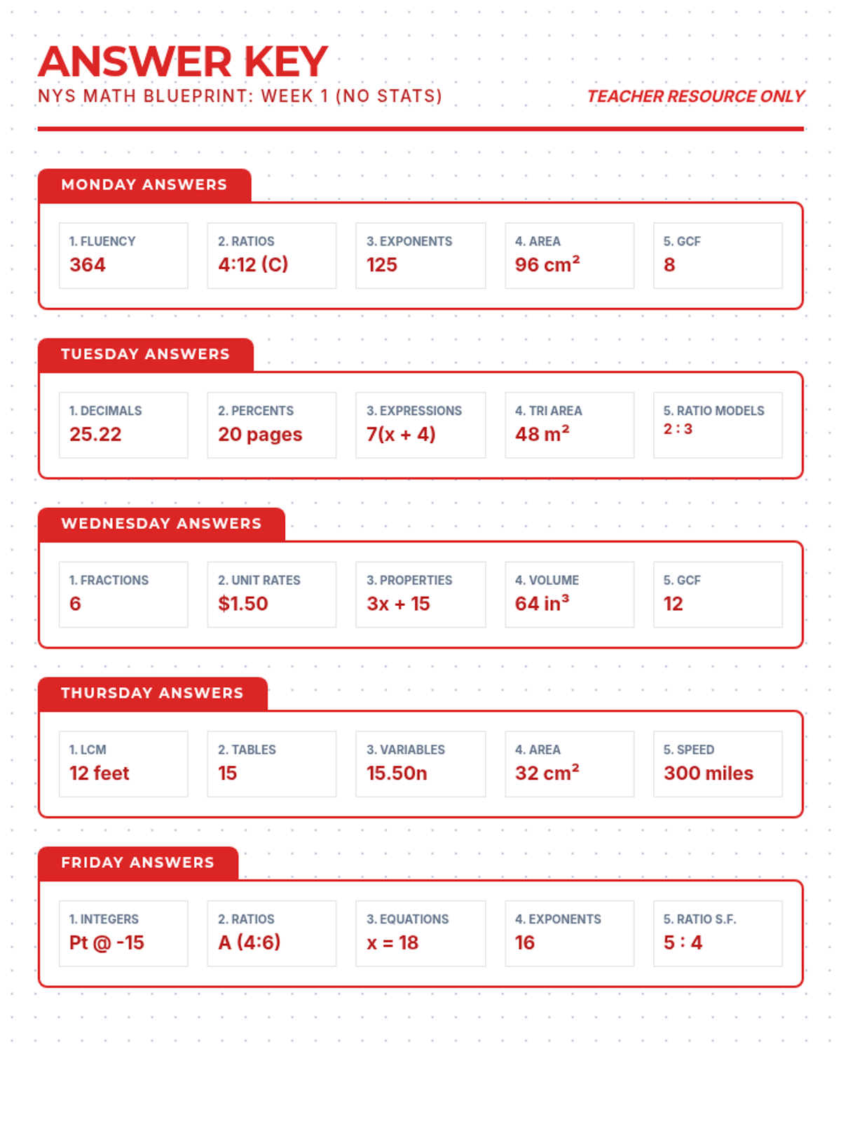 Teacher answer key for the Week 7 Math Blueprint spiral review, updated for NYS alignment and color-coded in red for easy grading. Revised for page breaks.