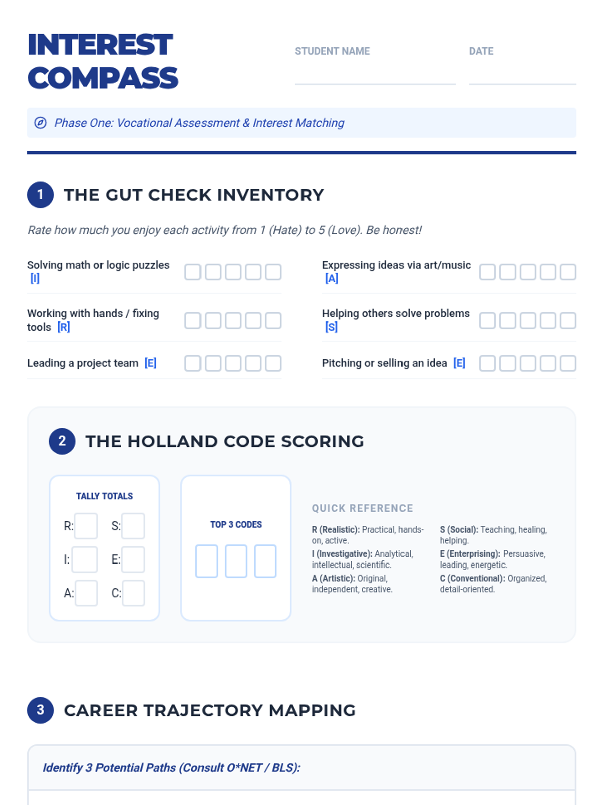 Complex career matching scenarios for high school students. Students analyze profiles with education constraints, values, and skills to determine optimal market paths.