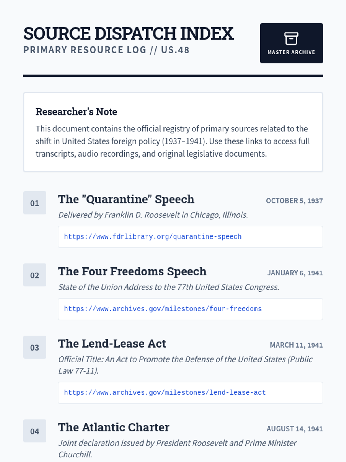 A visual slide deck covering the key events leading to U.S. entry into WWII, including FDR's major speeches and the attack on Pearl Harbor, with explicit names and dates for every source.