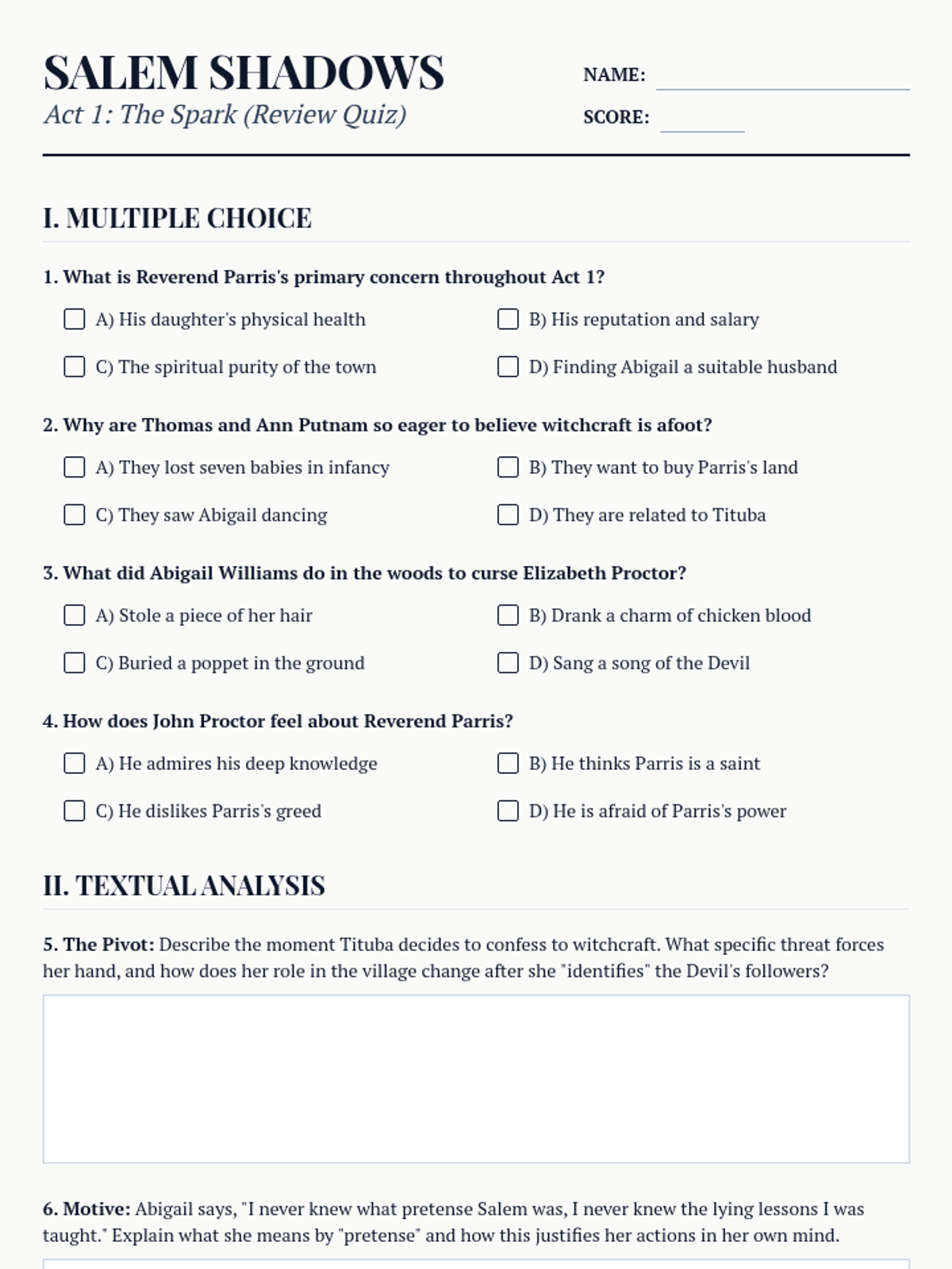 A review quiz for Act 1 of 'The Crucible', featuring multiple-choice questions on character motivations and short-answer questions on Tituba's confession and Abigail's perspective.