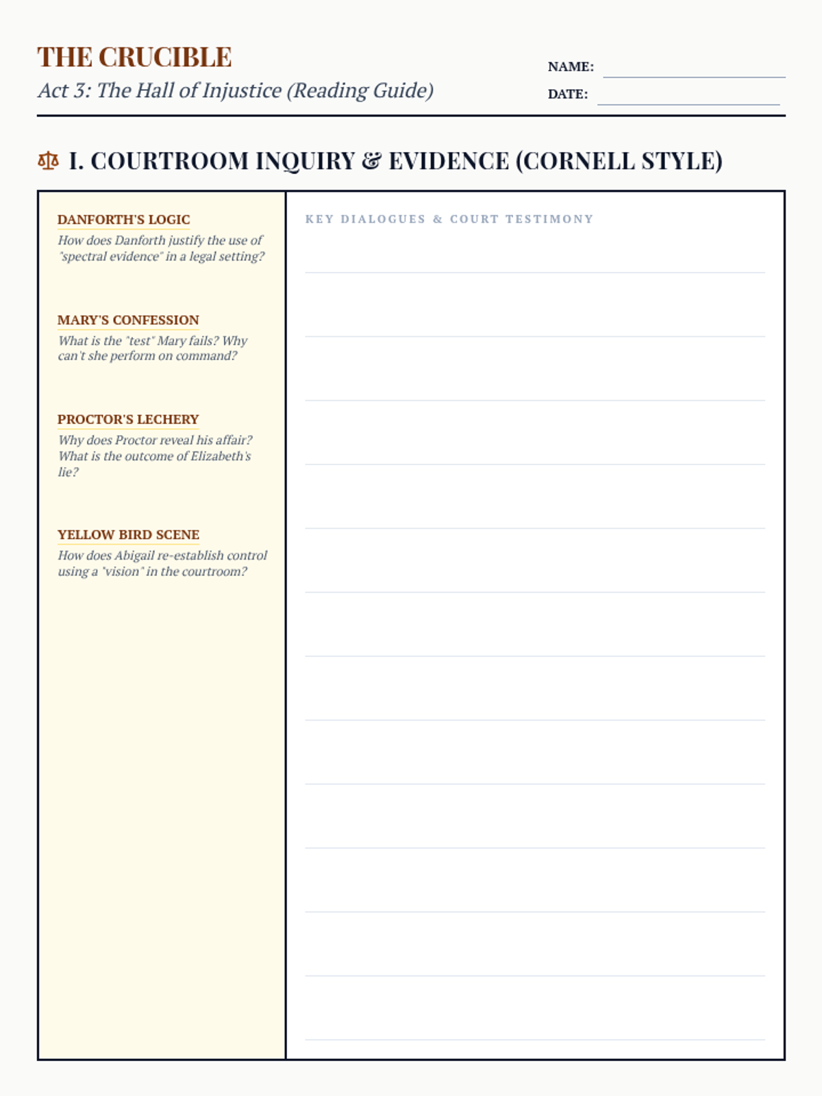 A two-page independent reading guide for Act 3 of 'The Crucible' featuring compact Cornell notes on page one and analytical organizers.