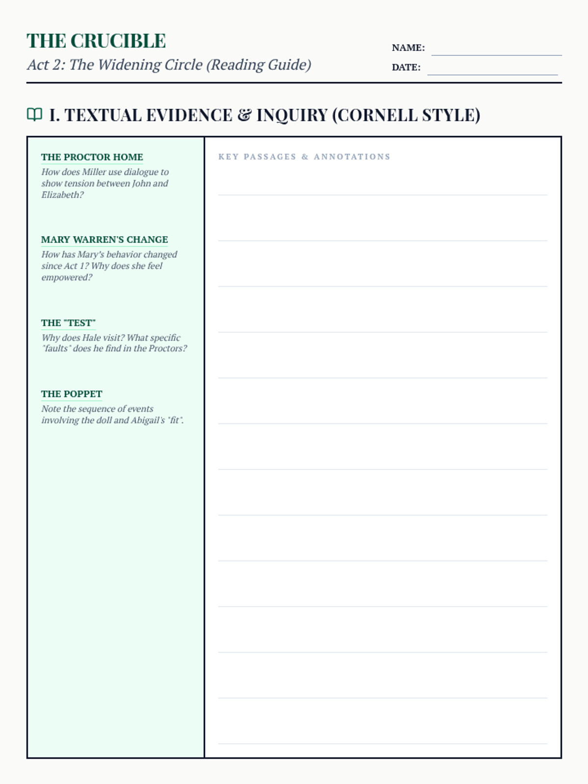 A two-page independent reading guide for Act 2 of 'The Crucible' featuring compact Cornell notes on page one and analytical organizers.