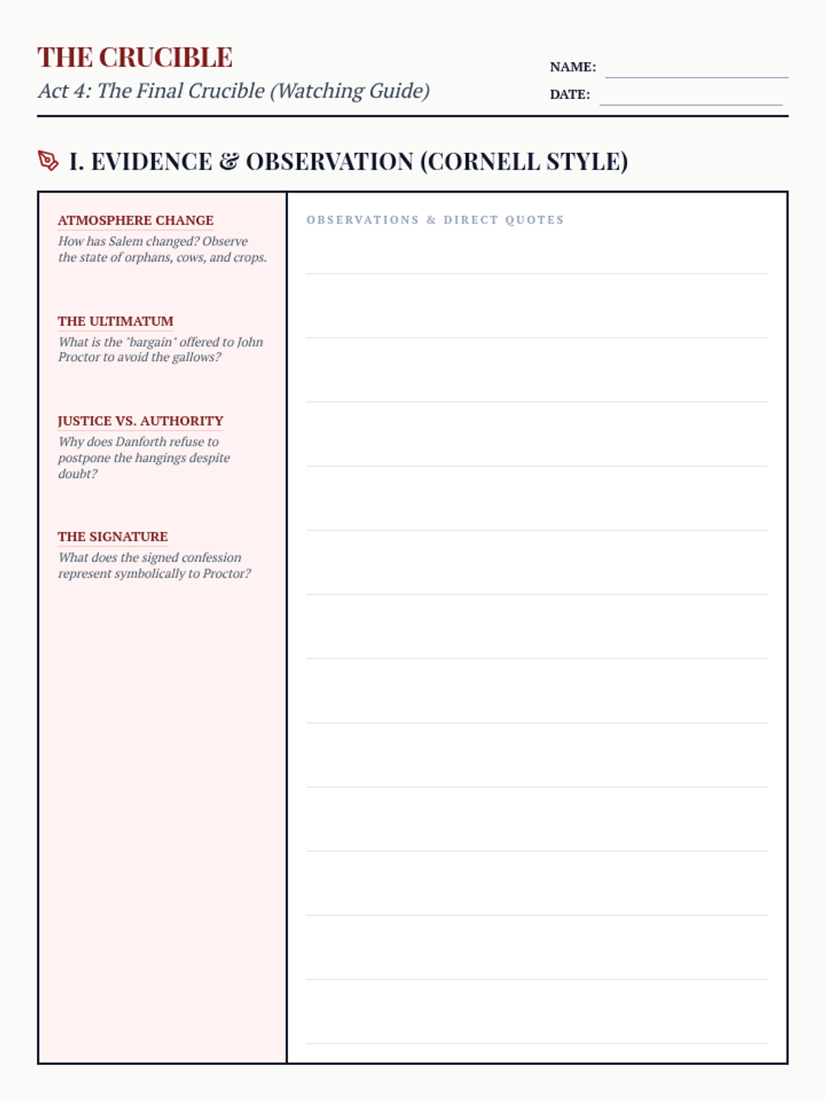 A two-page independent watching guide for Act 4 of 'The Crucible' featuring compact Cornell notes on page one and thematic resolution analysis.
