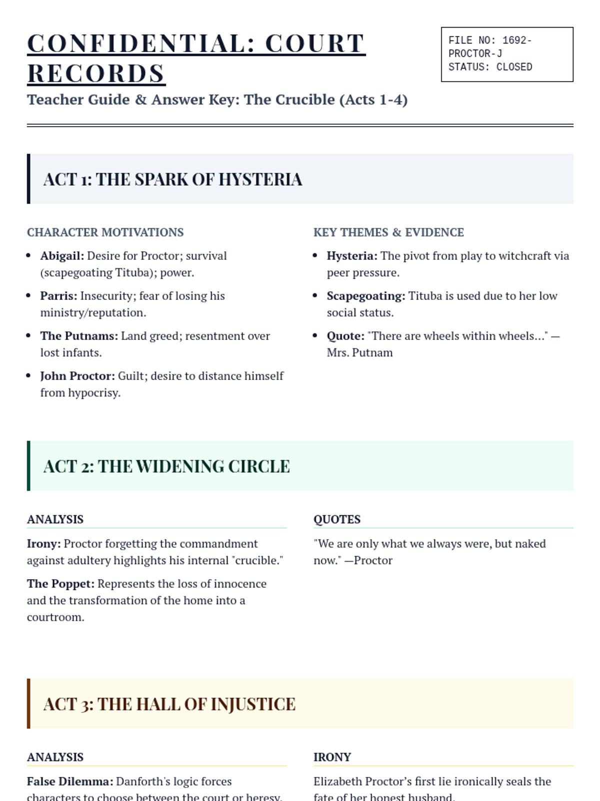 A comprehensive teacher key covering Acts 1 through 4 of 'The Crucible', providing targeted analysis, character motivations, and instructional guidance for both watching and reading guides.