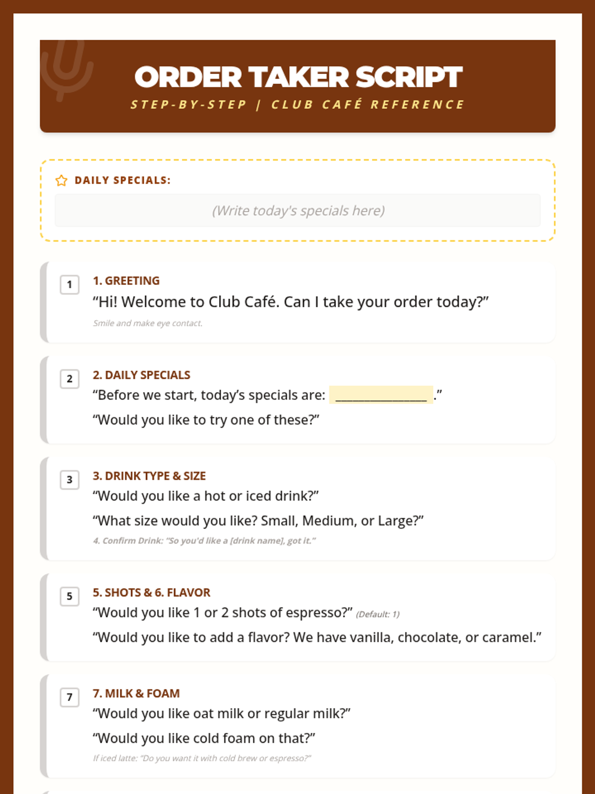 A step-by-step laminated script for Order Takers to follow, covering greetings, drink options, customizations, and pastry pairings.