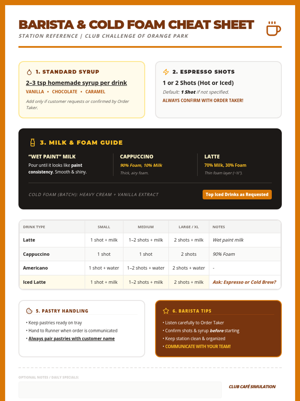 A detailed barista cheat sheet covering syrup standards, espresso shots, milk and foam preparation, drink ratios, and pastry handling tips.