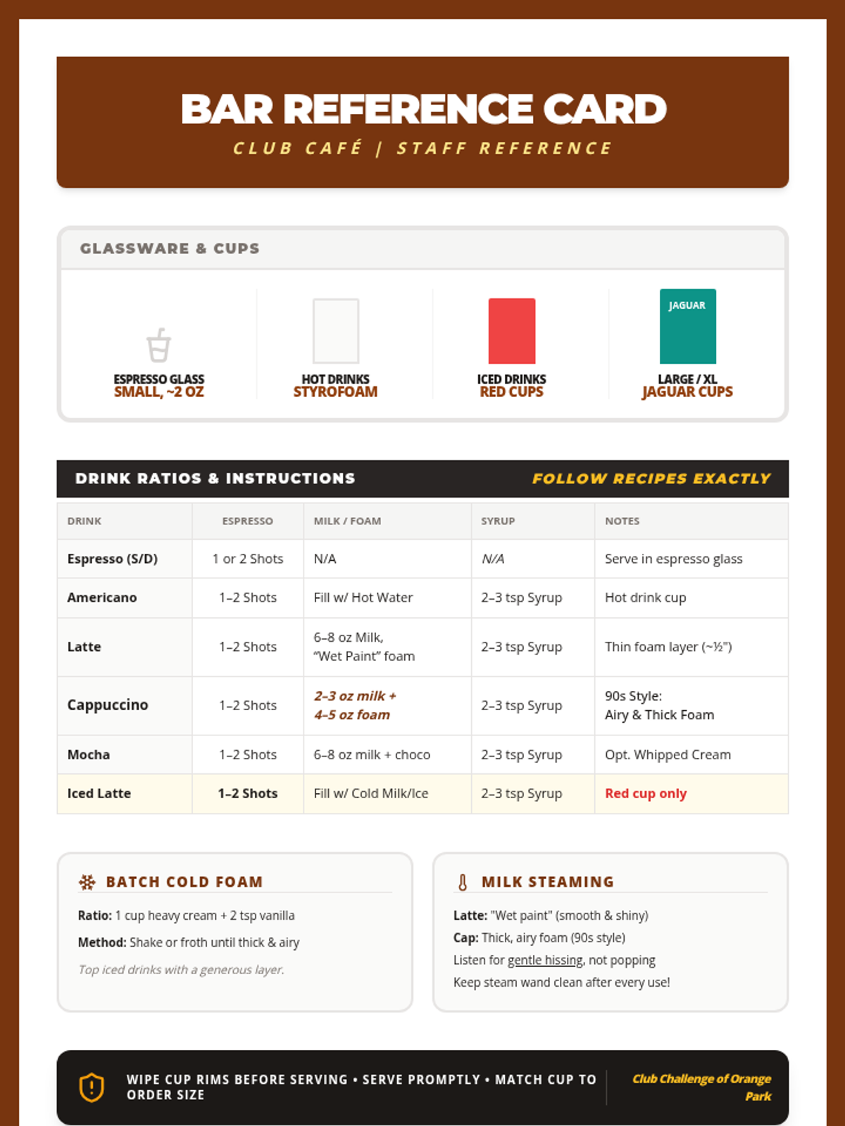 A visual reference card for café staff detailing cup types, drink ratios for hot and iced beverages, milk steaming techniques, and cold foam preparation.