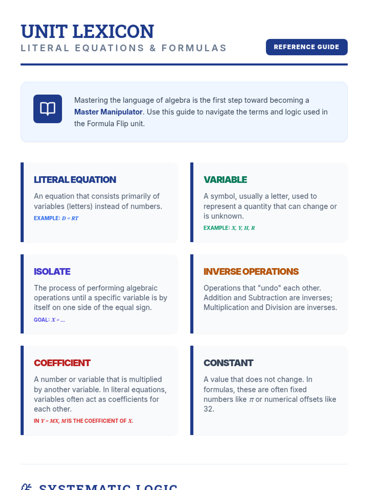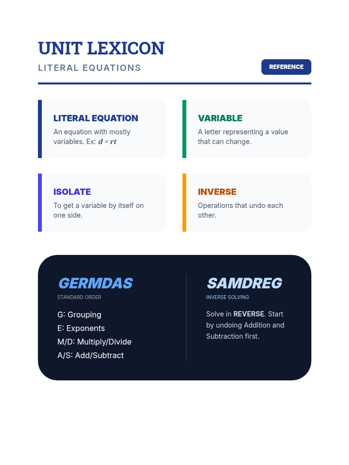 A concise exit ticket to assess students' understanding of the conceptual link between standard equations and literal equations.