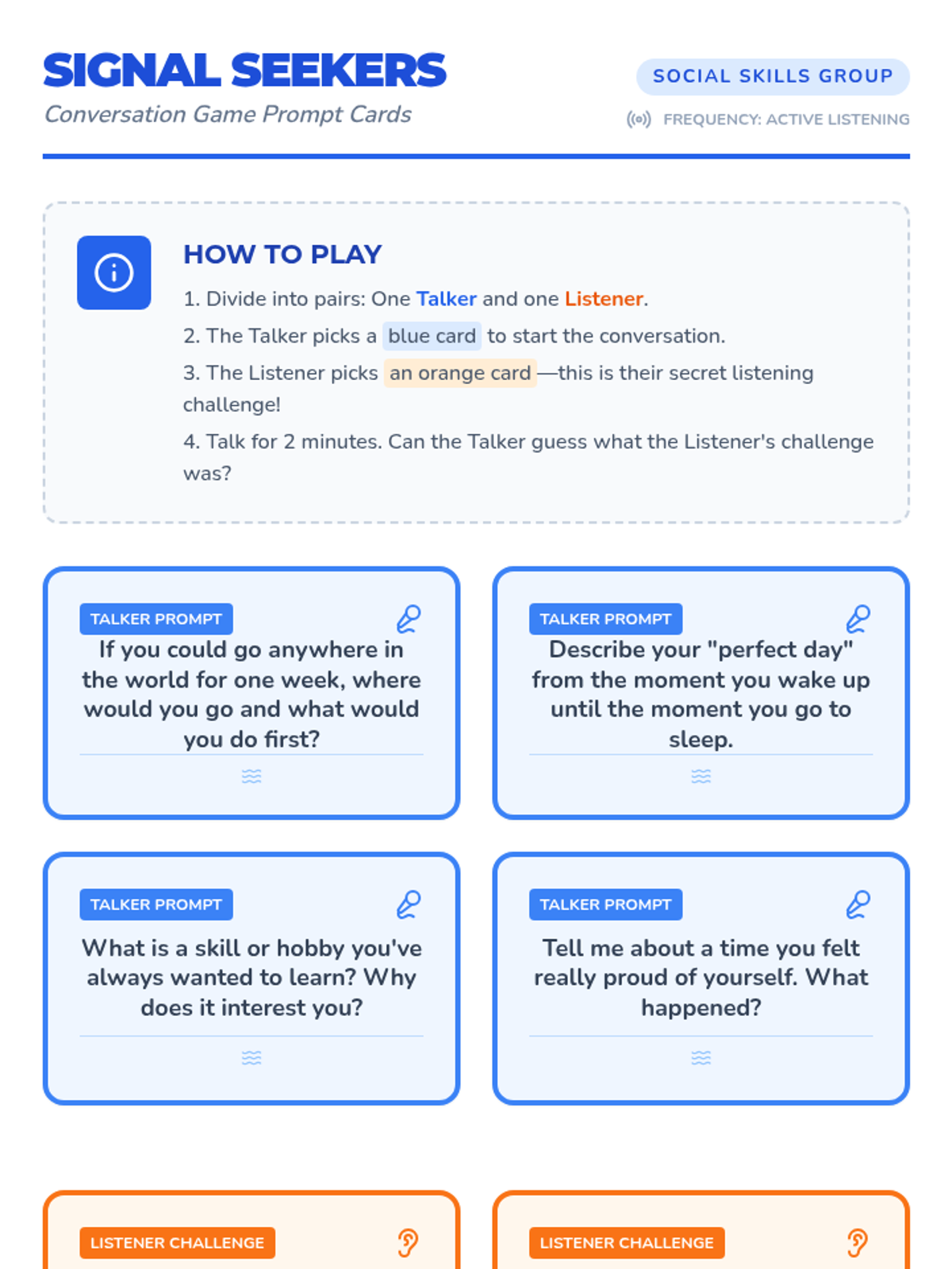 A collection of printable prompt cards for the Signal Seekers game. Includes 4 Talker prompts and 6 Listener challenges that focus on body language and active listening. Updated with corrected grammar and improved print layout.