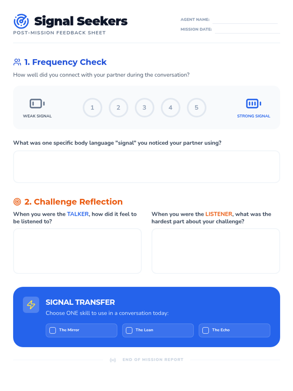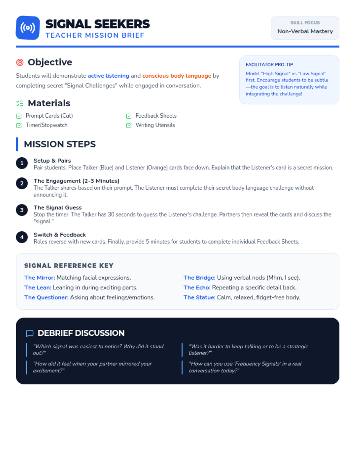 A consolidated one-page facilitator guide for the Signal Seekers game. Includes objectives, procedure, a reference key for the body language signals, and discussion prompts. Updated with improved layout to ensure single-page printing.