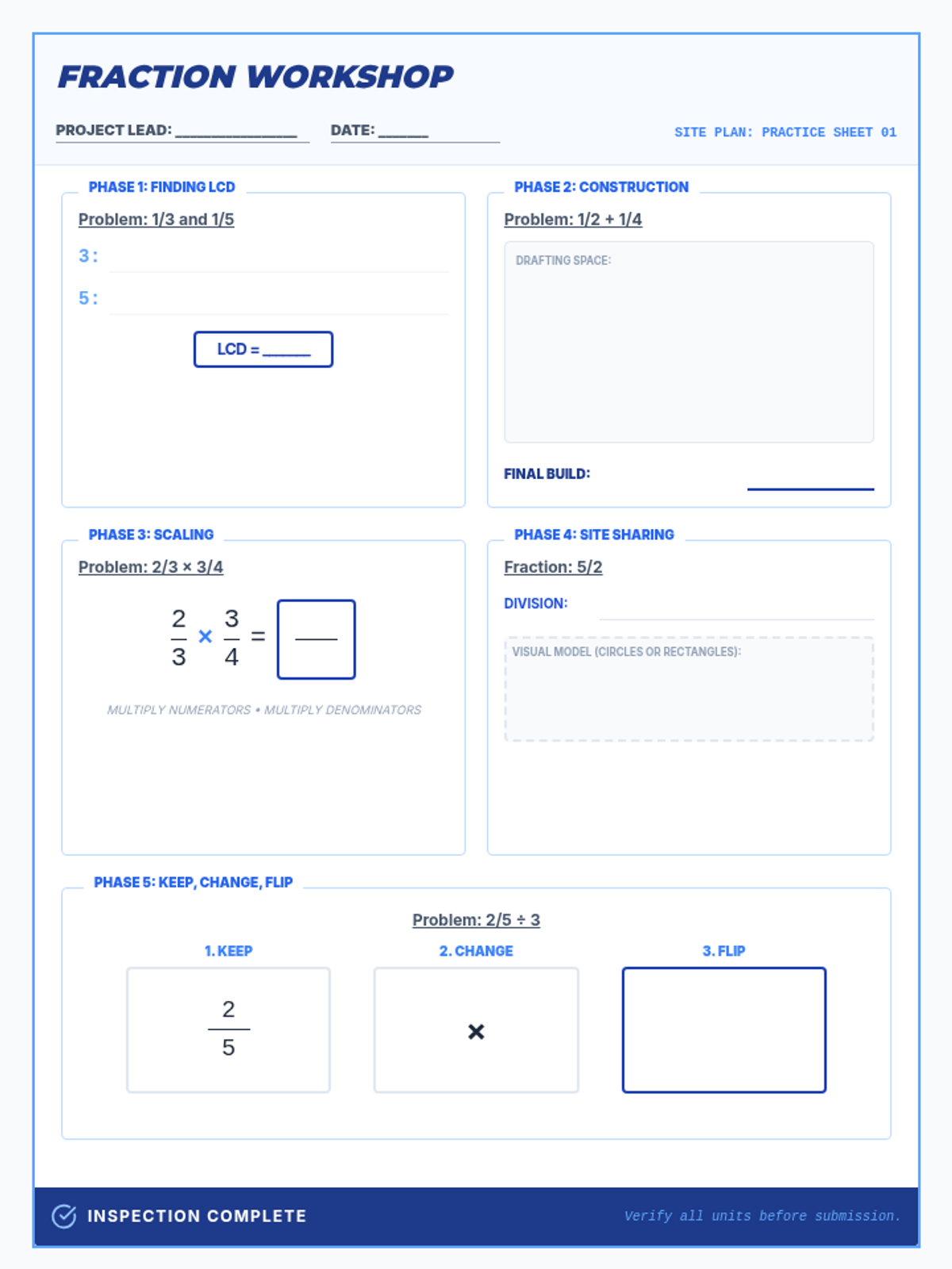 A practice graphic organizer for fraction operations using a workshop/blueprint theme. Final revision with improved notation consistency and better label contrast.