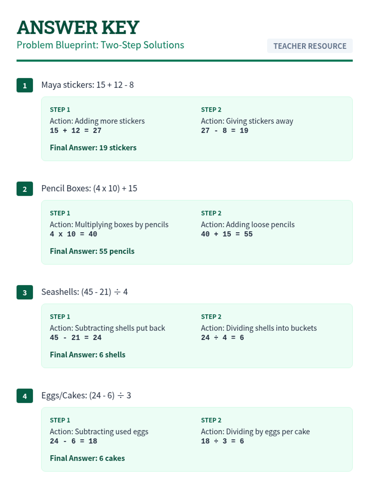 An answer key for the Problem Blueprint Assessment, providing expected actions and number sentences for each step of the word problems. Updated to reflect the new assessment layout.