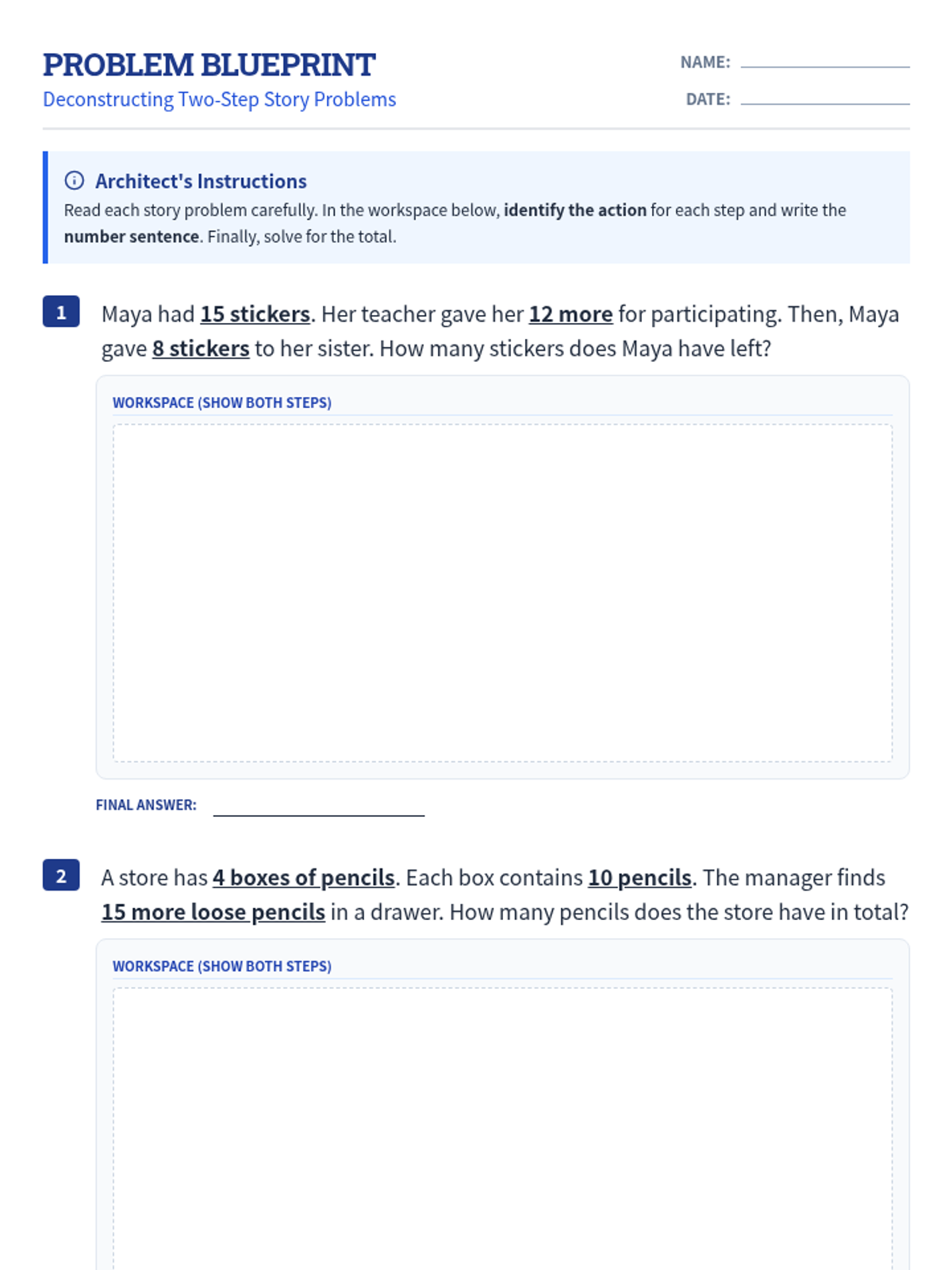 A structured assessment for solving two-step word problems, requiring students to identify the mathematical action and provide number sentences for each step. Revised with extra-large workspace boxes (h-64) for each problem, now spanning three pages.