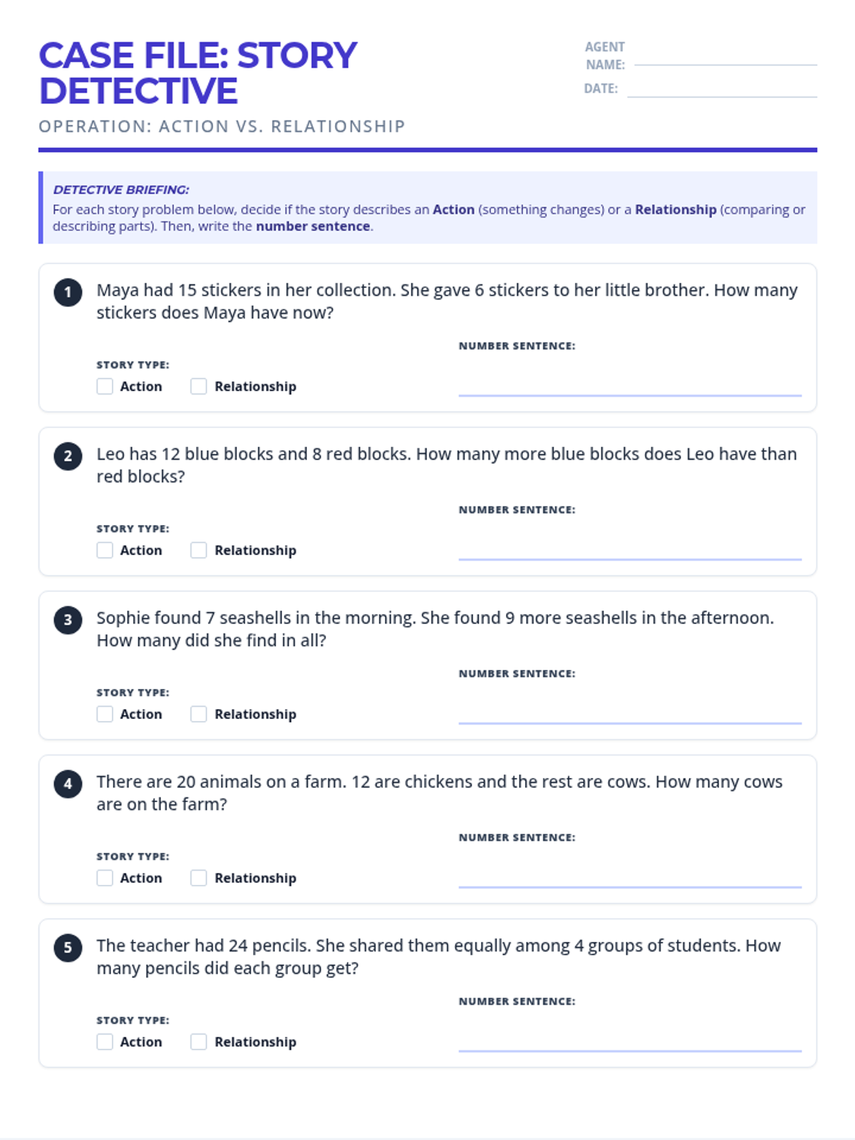 A 10-problem assessment for identifying whether a mathematical story represents an Action (change) or a Relationship (static comparison/parts) and writing the corresponding number sentence.