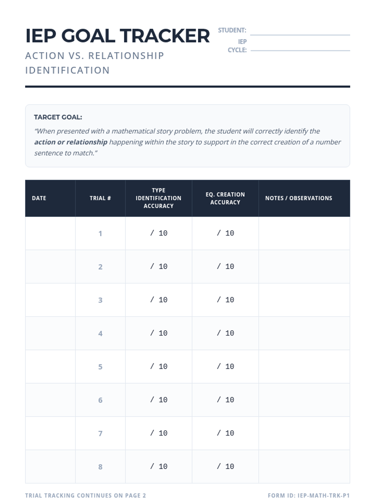A progress tracking sheet for teachers to record student performance on identifying whether a story represents an Action or Relationship and their accuracy in writing matching number sentences.