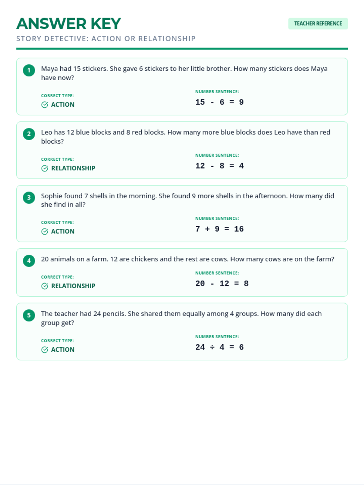 An answer key for the Story Detective Assessment, providing correct categorizations for Action or Relationship stories and the matching number sentences.