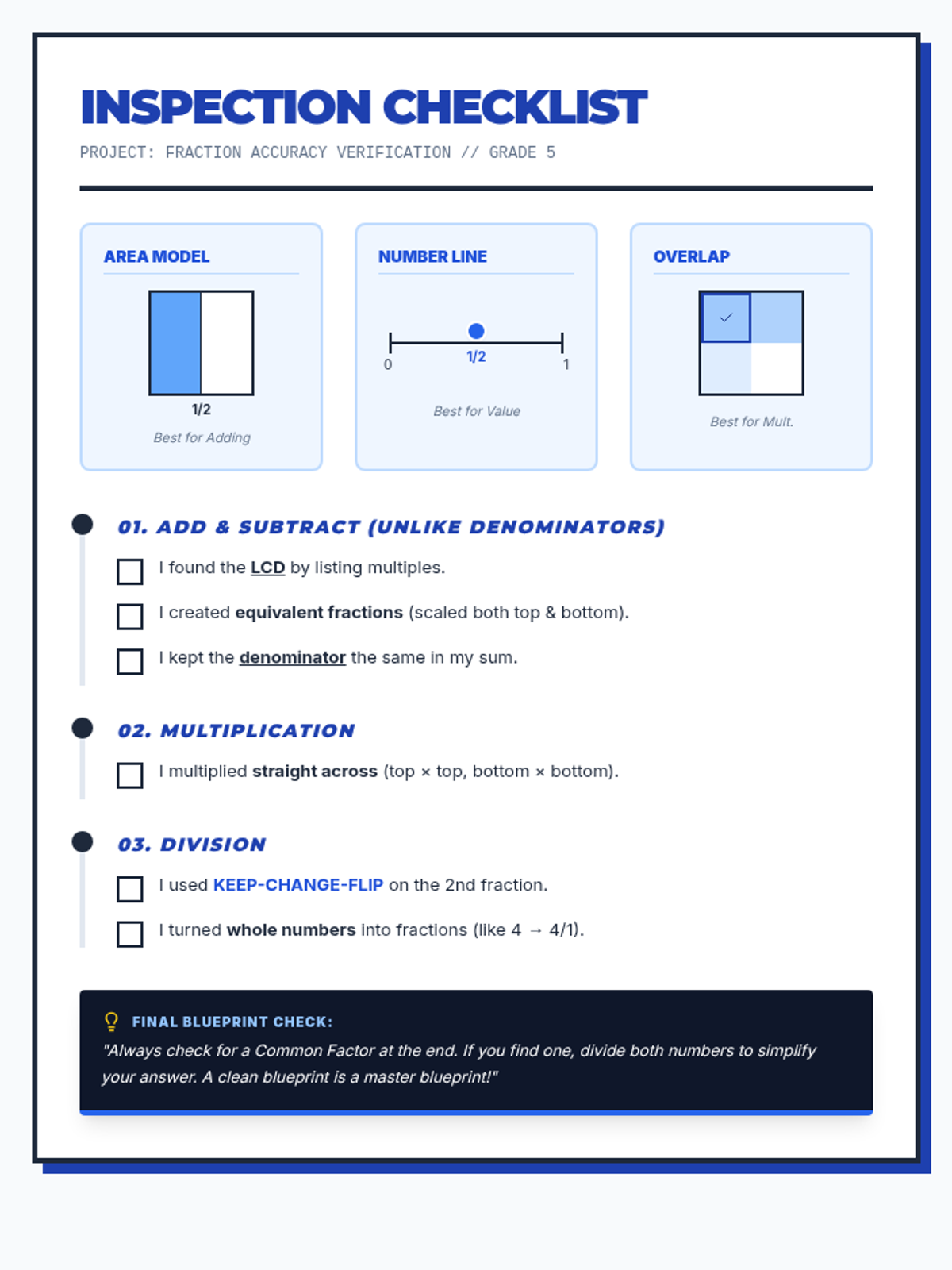A step-by-step inspection checklist for fraction operations. Revised with larger, more descriptive visual models and optimized layout to prevent page break issues.