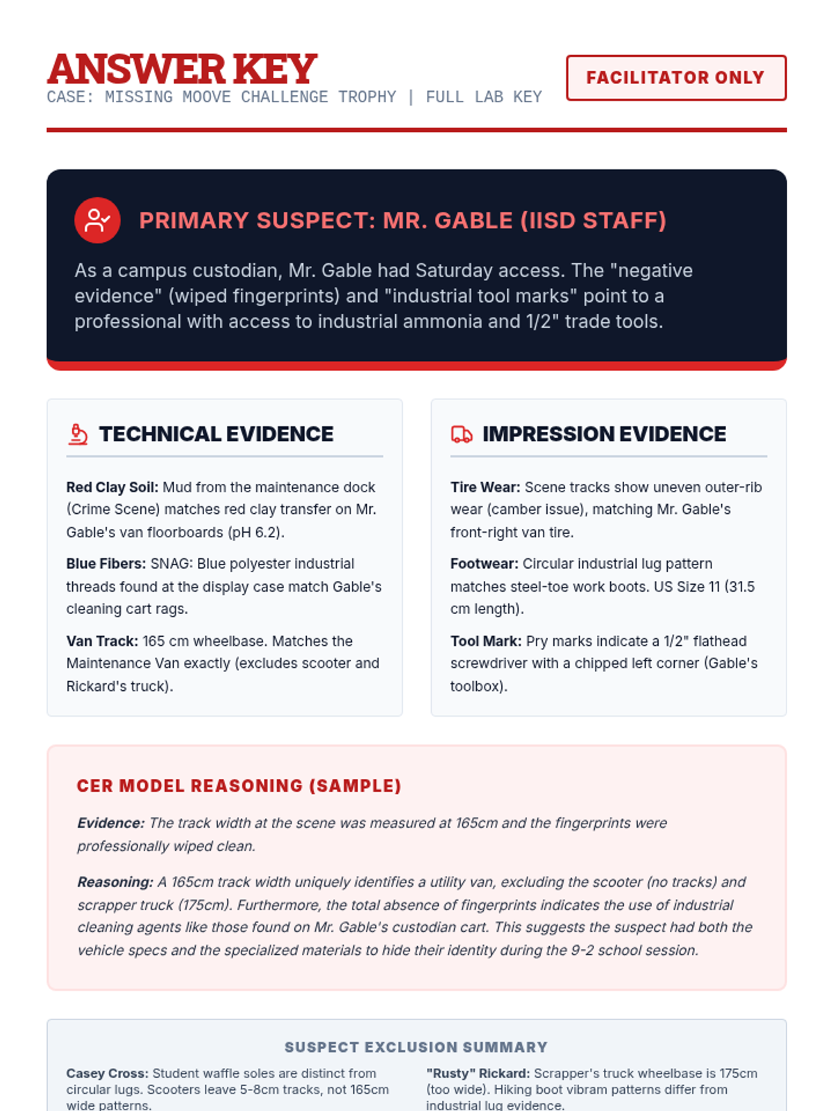 Teacher answer key for the Moove Mystery lab, detailing the evidence links to Mr. Gable (IISD Staff) and the logic for excluding others. Structured for the two-day investigation (Monday/Tuesday).