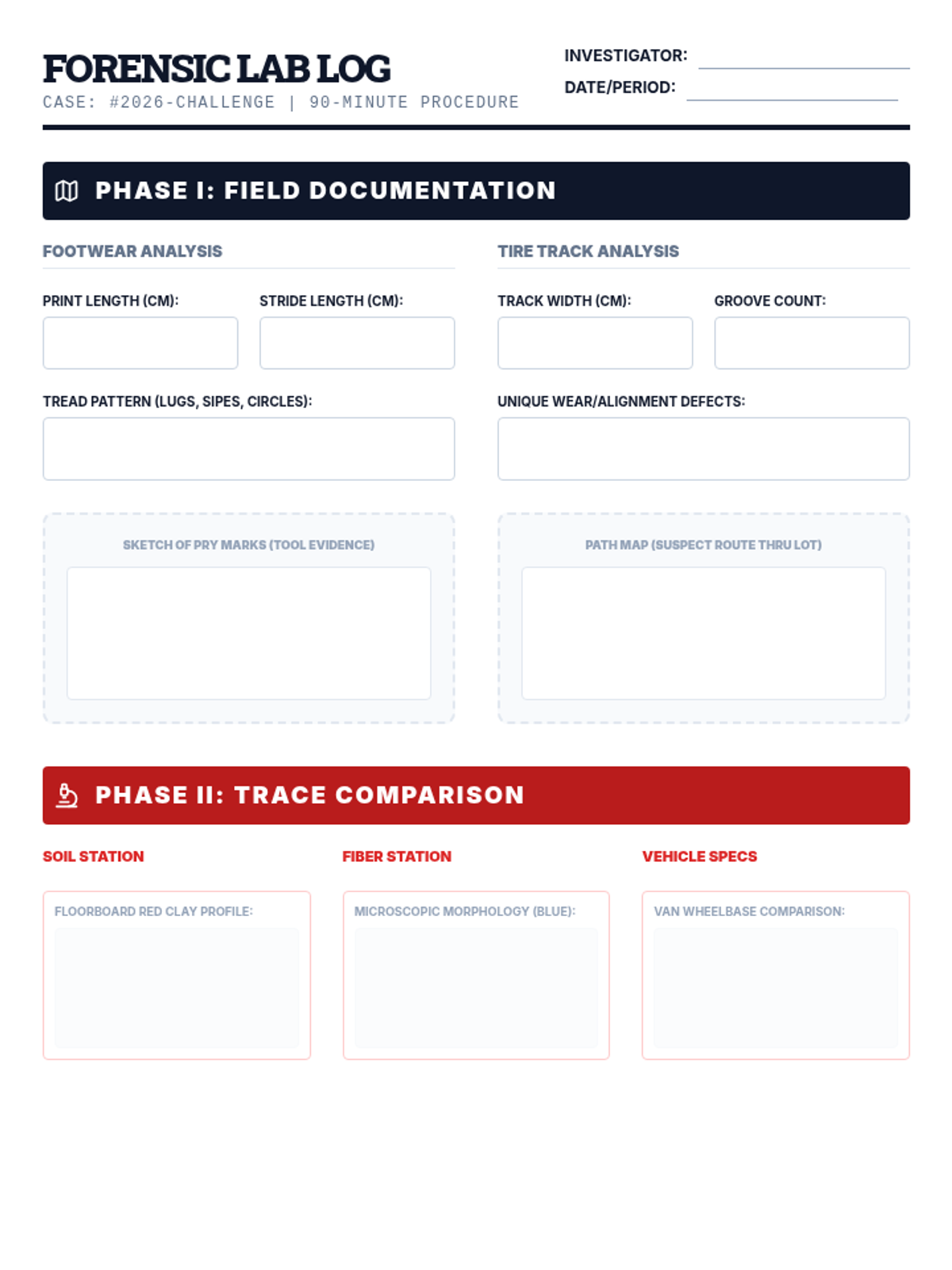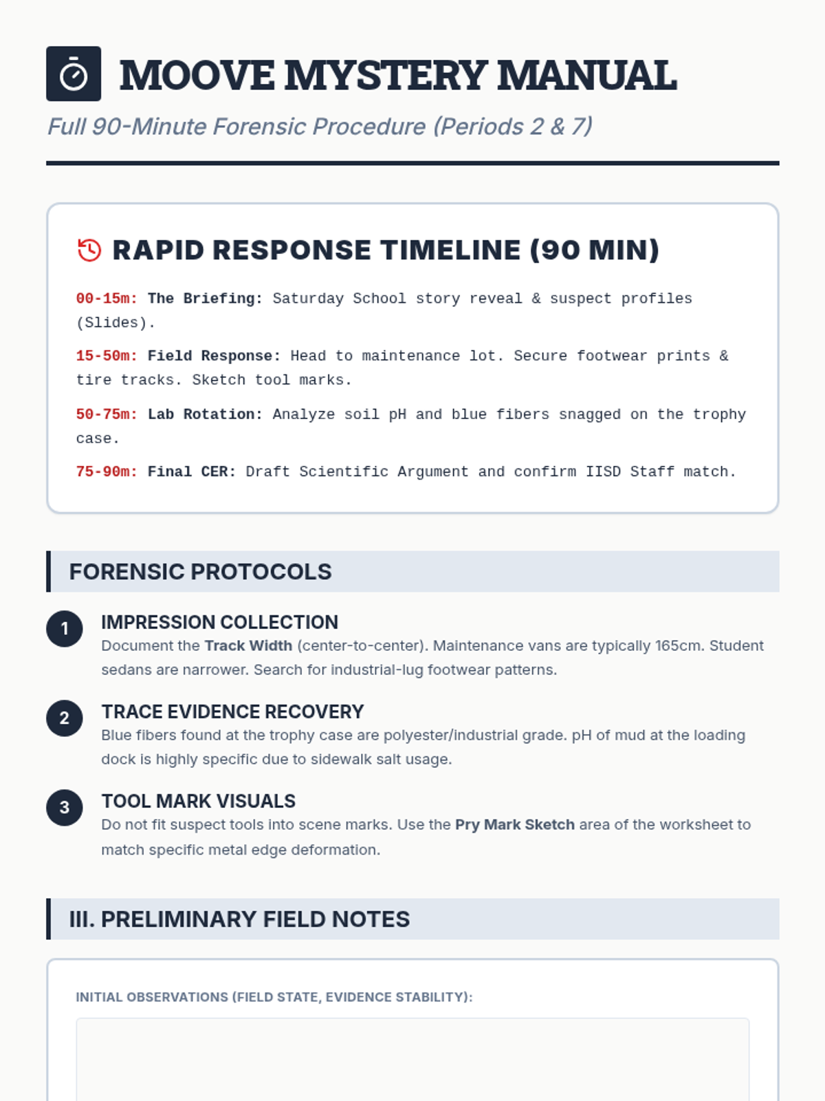 Instructional manual for the Moove Mystery lab, focused on outdoor impression collection and tool mark analysis. Now structured for a two-day period (Monday field work and Tuesday lab analysis). Includes updated Saturday School context and teacher guidance.