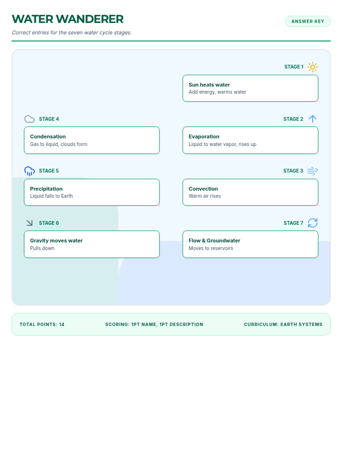 An answer key for the Water Wanderer worksheet, providing the correct stage names and concise descriptions for all seven parts of the water cycle. Repositioned to ensure no overlaps and improve visual clarity.