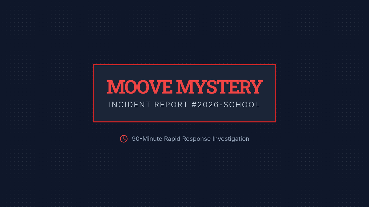 Introductory presentation for the Moove Mystery lab, featuring the crime scene narrative, tool mark overview, and the significance of negative fingerprint evidence. Now includes Saturday school context and Monday/Tuesday two-day investigation structure.