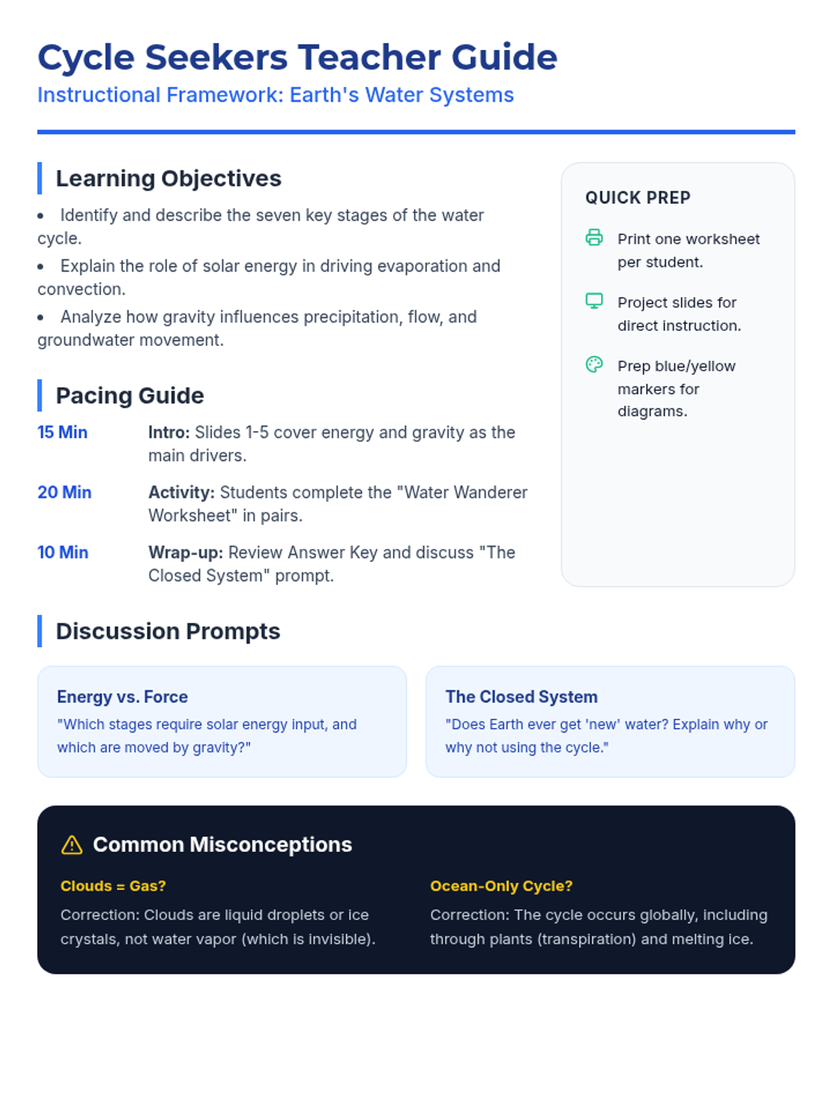 A comprehensive teacher's guide for the Cycle Seekers lesson, including learning objectives, pacing, discussion prompts, and notes on common misconceptions. Optimized for single-page use.