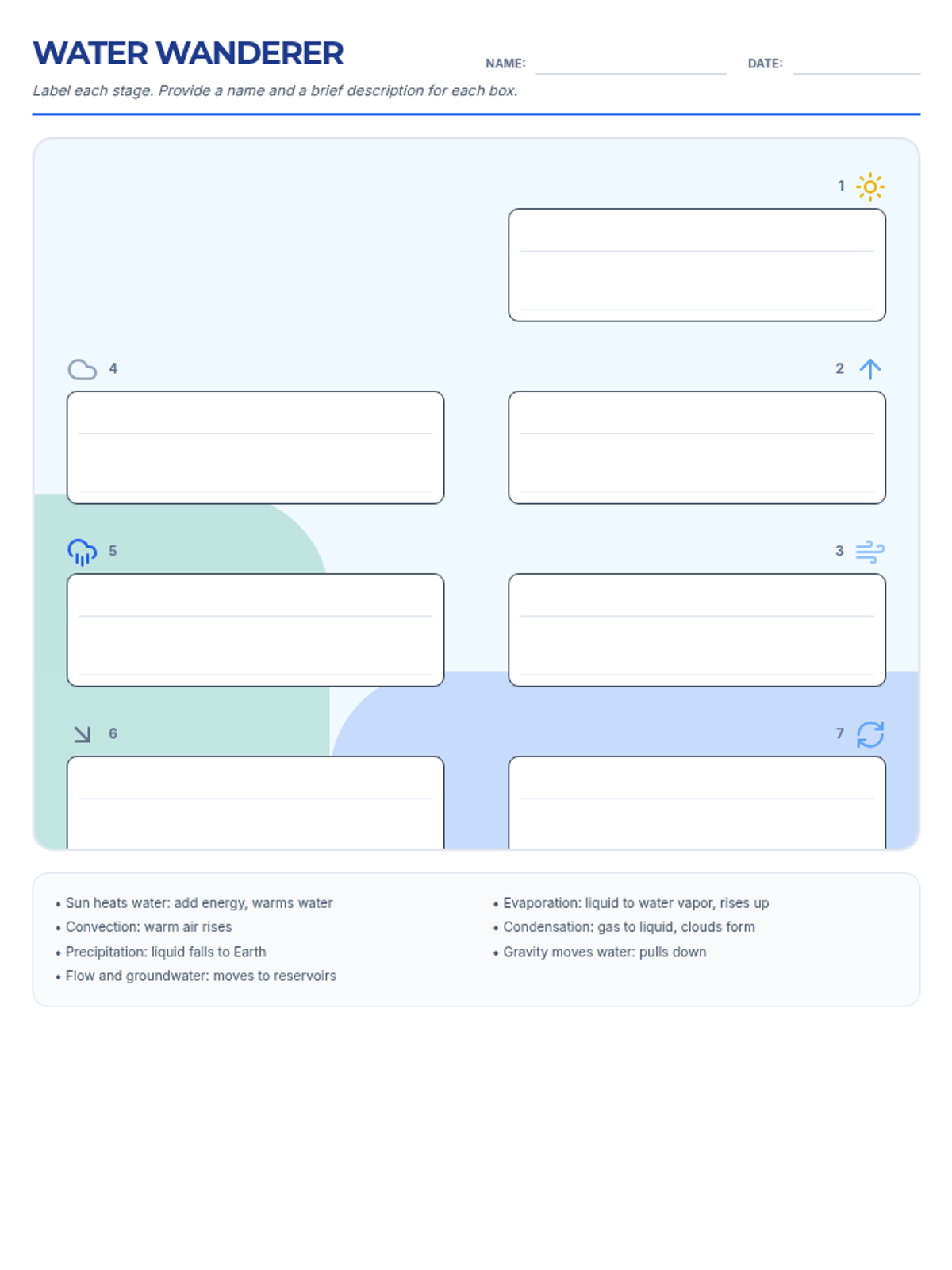 A student worksheet featuring a water cycle diagram with blank labeling areas for seven key stages, requiring students to provide both names and descriptions. Optimized for one-page printing with enhanced handwriting space and high-contrast visuals.