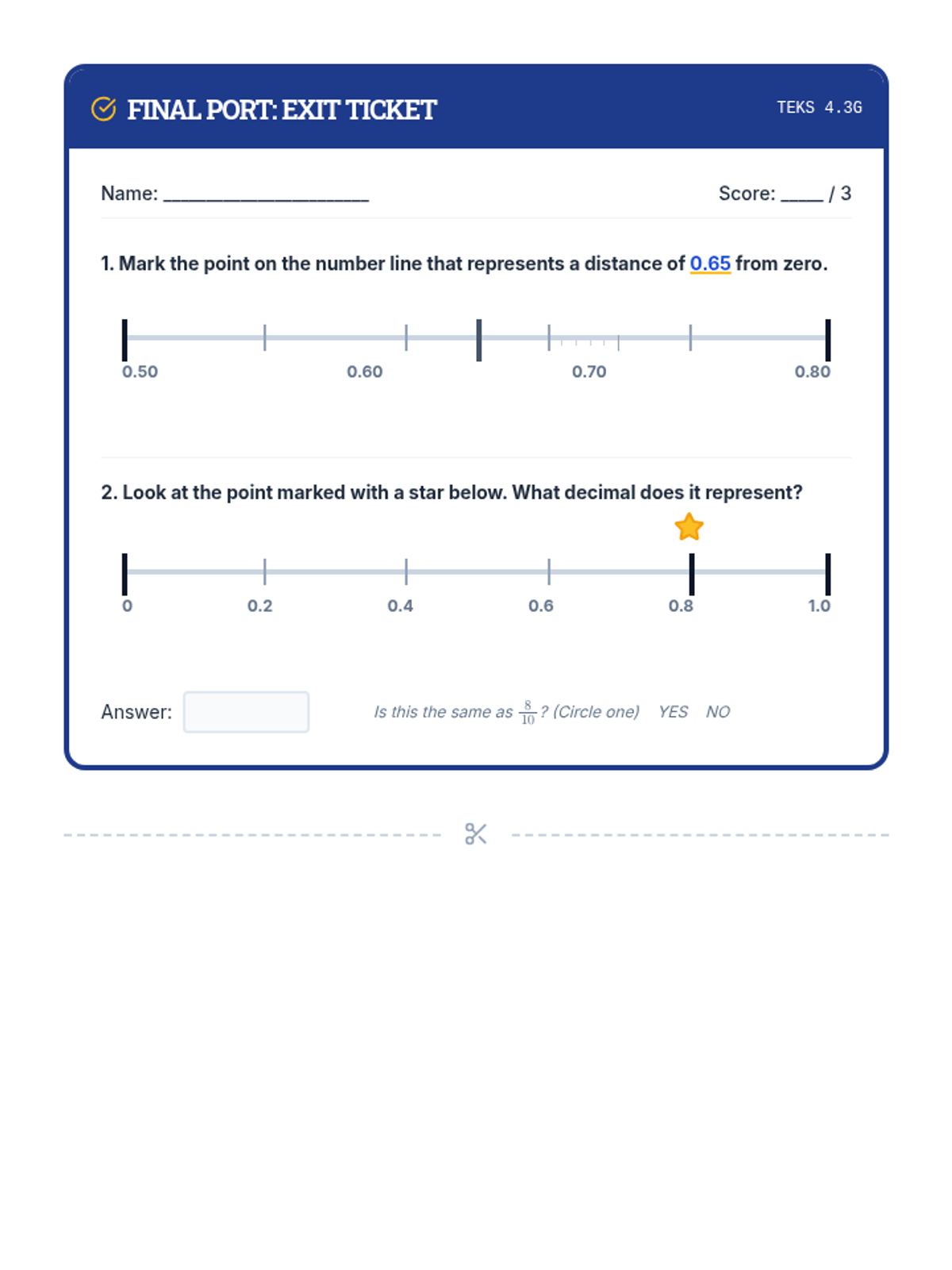 A quick assessment (exit ticket) for TEKS 4.3G. Students demonstrate mastery in plotting a hundredth decimal and identifying a tenth decimal on number lines. Designed with two per page for easy printing.