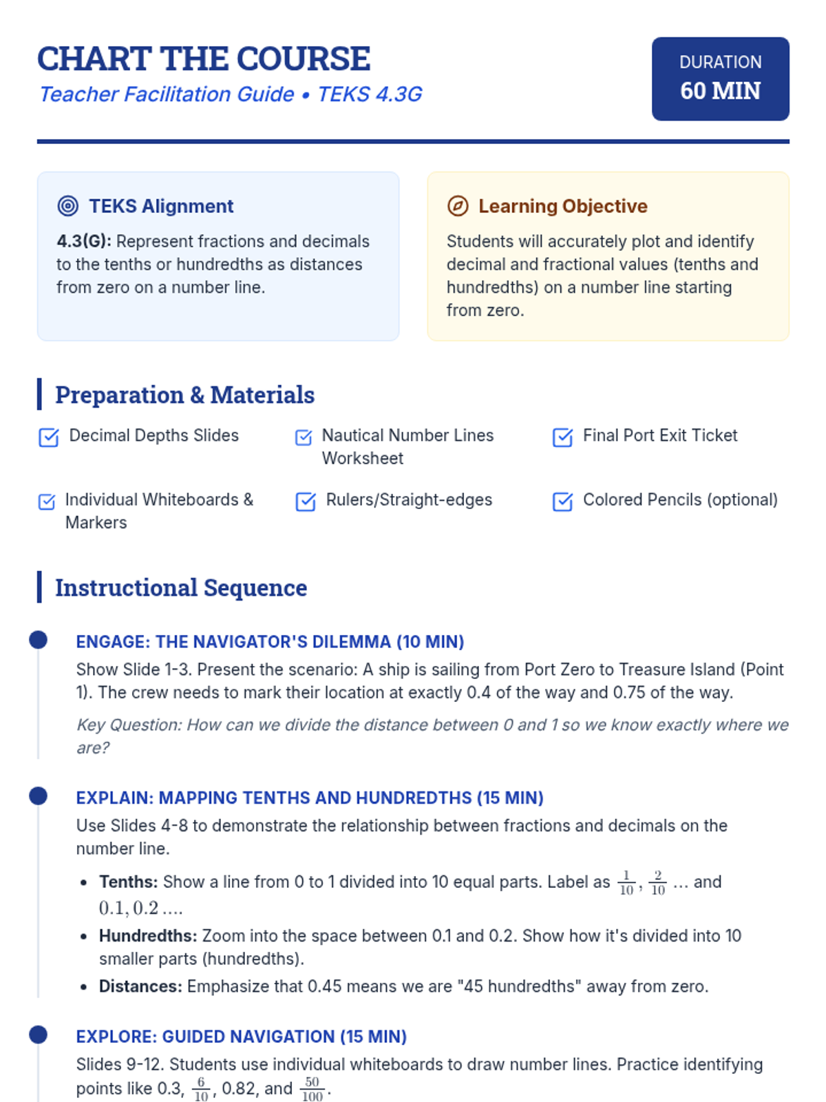 A teacher guide for a 4th-grade math lesson on TEKS 4.3G, featuring a nautical navigation theme, instructional flow, and differentiation strategies for representing decimals on number lines.