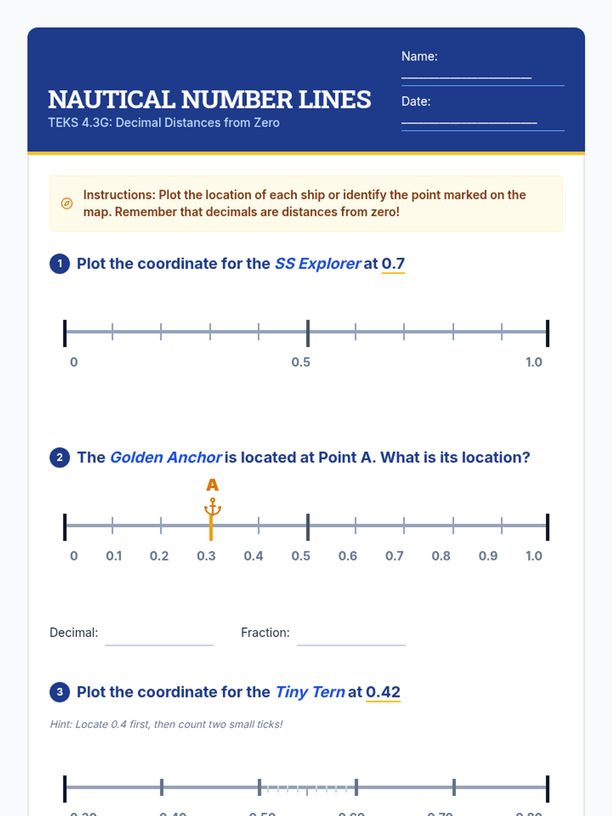 A student worksheet for TEKS 4.3G featuring a nautical map theme. Students practice plotting and identifying decimals and fractions (tenths and hundredths) as distances from zero on number lines.